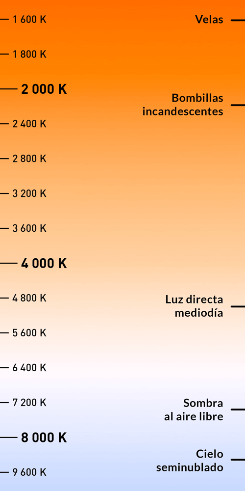 Estos términos hacen referencia a la temperatura de color de la luz. Y, ¿qué significa esto? Viene a medir la sensación que tiene tu ojo al ver una luz. Hablamos de luz cálida cuando predomina el tono ámbar y de luz fría cuando el tono predominante es el azul.