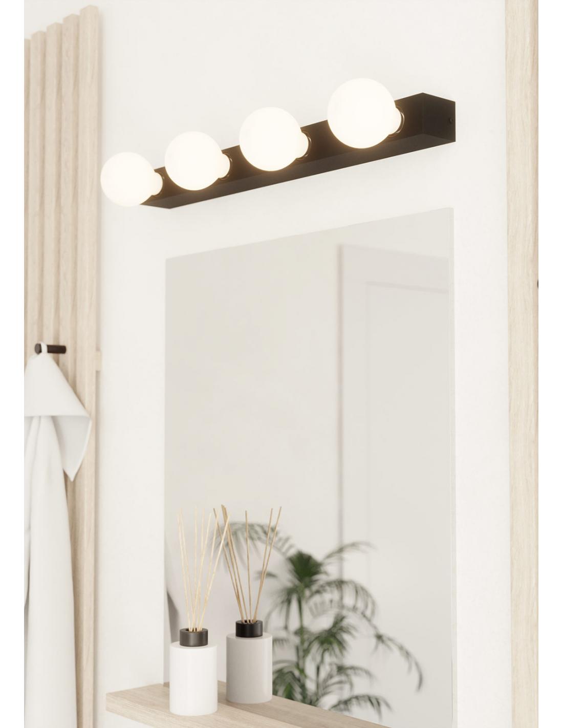 Aplique de pared de 4 luces en aluminio color negro. El aplique de las estrellas de cine, Guanal es perfecto para iluminar tu tocador, baño o cualquier zona que necesite mucha luz, donde además tendrás un extra de decoración. Necesita 4 bombillas de casquillo E27, y recomendamos elegir bombilla blanca o vintage para un mejor resultado (no incluidas).