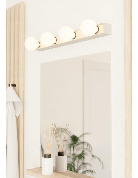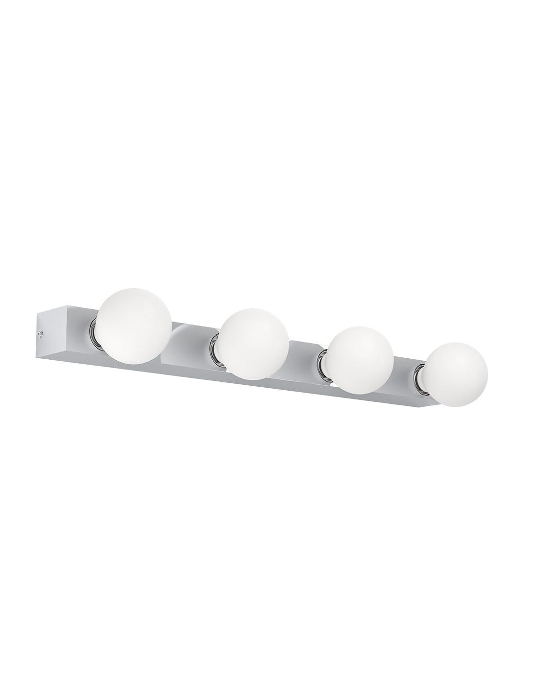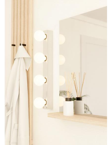 Aplique de pared de 4 luces en aluminio color cromo. El aplique de las estrellas de cine, Guanal es perfecto para iluminar tu tocador, baño o cualquier zona que necesite mucha luz, donde además tendrás un extra de decoración. Necesita 4 bombillas de casquillo E27, y recomendamos elegir bombilla blanca opal para un mejor resultado (no incluidas).
