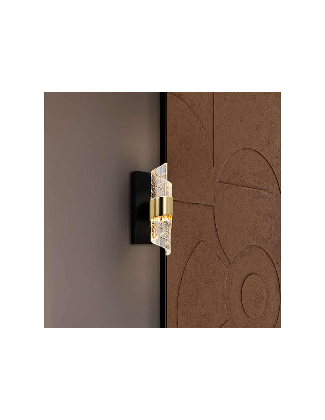 Lámpara de pared de 1 luz LED. Realizada en metal acabado negro mate y oro brillo. Tulipa con diseño en espiral, realizada en acrílico moldeado y tallado. 7W LED. 656 lm. 3.000 K.