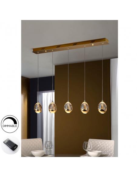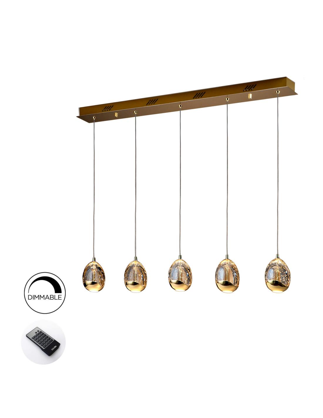 Lámpara de 5 luces LED. Realizada en metal acabado dorado. Tulipas con forma de gota realizadas en cristal macizo en tono champán, con burbujas decorativas en su interior. Regulables en altura. 25W LED. 2.400 lm. 3.000 K. DIMABLE. Este producto incluye drivers led con dimado de 0-10V o PWM, un receptor y un mando a distancia por radiofrecuencia. Para utilizar con regulador de pared, usar sólo dimmers de estos dos tipos de regulación. Otro tipo de dimado dañaría el driver led.