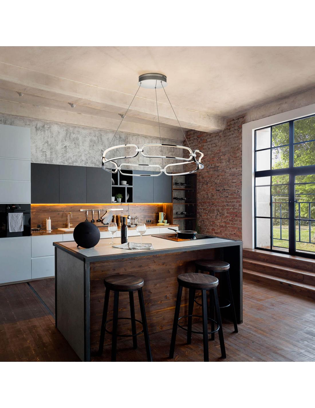 Lámpara LED grande, realizada en aluminio acabado cromo. Difusores de silicona opal. Regulable en altura. 65W LED, 5.850 lm, 3.000 K. DIMABLE. Este producto incluye drivers led con dimado de 0-10V. Para utilizar con regulador de pared, usar sólo dimmers de ese tipo de regulación. Otro tipo de dimado dañaría el driver led.