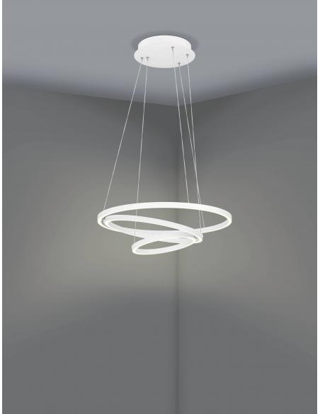 Lámpara colgante led minimalista blanca e inteligente con funciones programables, control remoto vía app gratuita o mando (no incluido) y regulación mediante estas funciones de la temperatura de su luz (desde 3000k neutra cálida hasta 6500k fría) además de regulación de la intensidad de su luz. Ideal para cualquier entorno, especialmente el salón. Esta lámpara está diseñada con círculos entrelazados realizados en aluminio de color blanco suspendidos de cableado, instalado sobre una base de acero de color blanco. LED integrado.