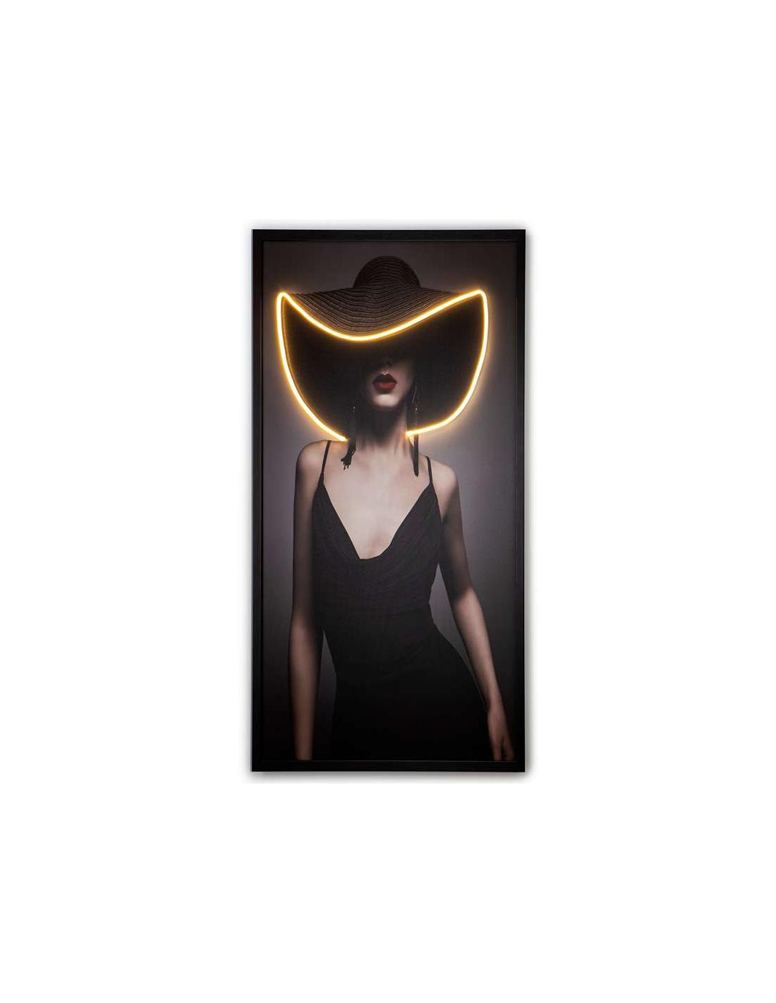 Mujer con pamela, composición con tira de luz led decorativa. Lienzo impreso, pegado sobre tabla y enmarcado en negro.