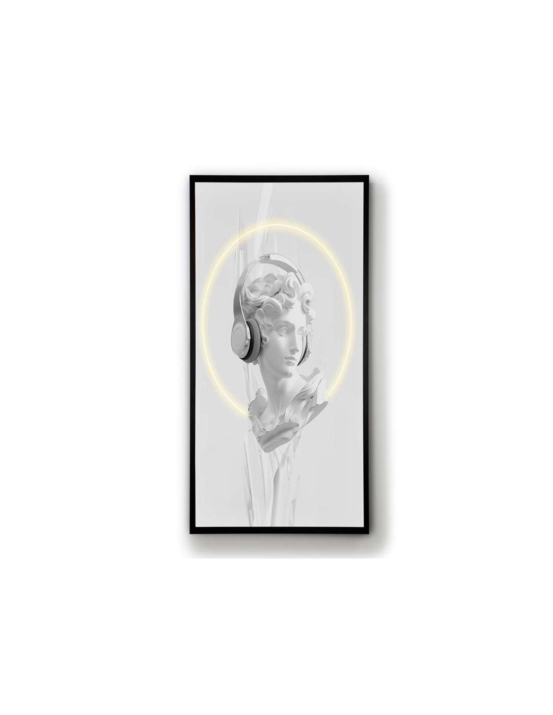 Busto clásico blanco con auriculares, composición con tira de luz led decorativa. Lienzo impreso, pegado sobre tabla y enmarcado en negro.
