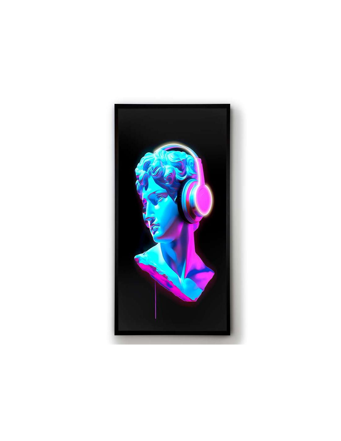 Busto clásico color con auriculares, composición con tira de luz led decorativa. Lienzo impreso, pegado sobre tabla y enmarcado en negro.