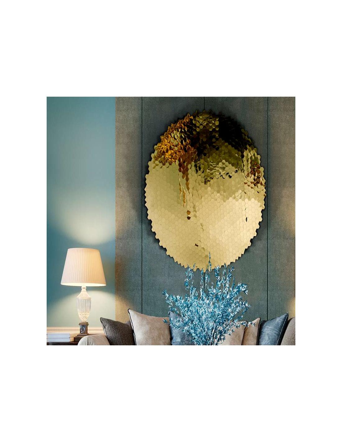 Bajorrelieve, realizada con láminas de acero inoxidable, formando una retícula esférica de poliedros. Acabado baño dorado brillante.