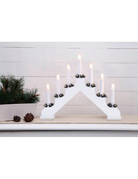 Candelabro de Navidad de madera con 7 luces LED que recuerdan a la estética de los candelabros judíos, un motivo decorativo muy bonito y diferente para estas fiestas. Funciona conectado a la luz y emite luz cálida.
