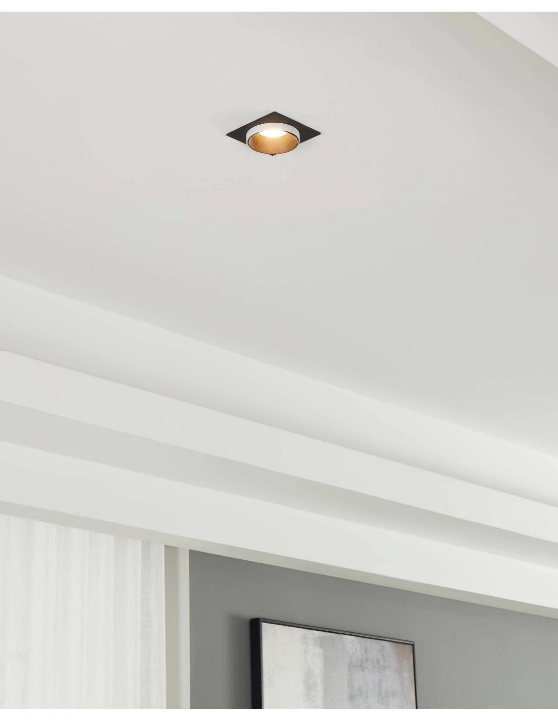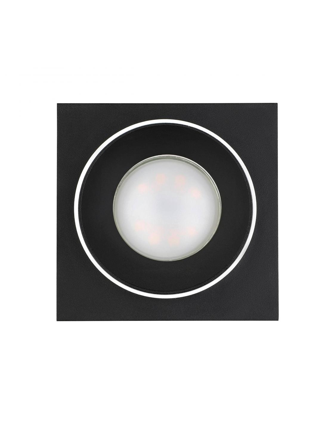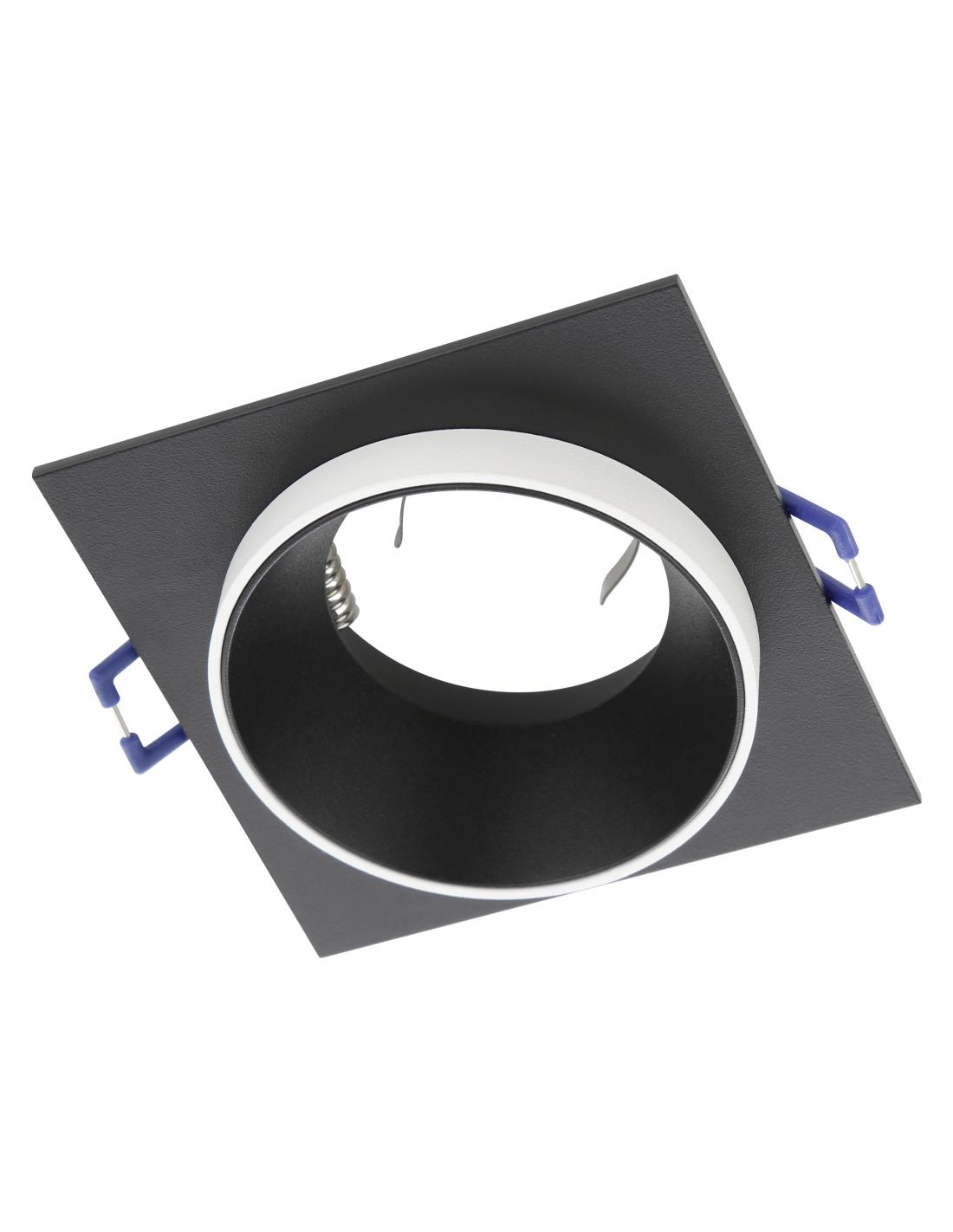 Lámpara empotrada cuadrada bicolor fabricada en aluminio de base negro con pieza circular blanca ideal para no ocupar espacio en tu hogar e iluminar cualquier rincón. Funciona con una bombilla GU10, no incluida.