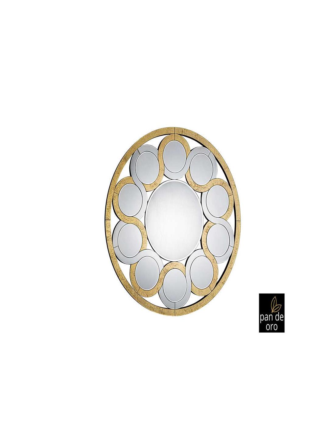 Espejo con luna central biselada. Greca de lunas y cristales con fondo en PAN DE ORO, biselados. Trasera de DM lacado en negro.