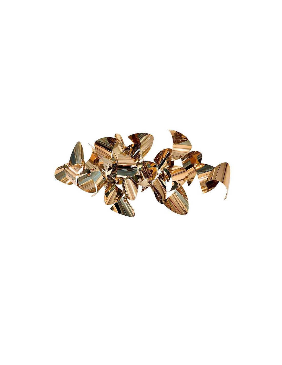 Escultura de pared realizada en plancha de acero inoxidable, composición de piezas curvadas en acabado baño de oro rosa. Preparado para colgar en posición horizontal y vertical.