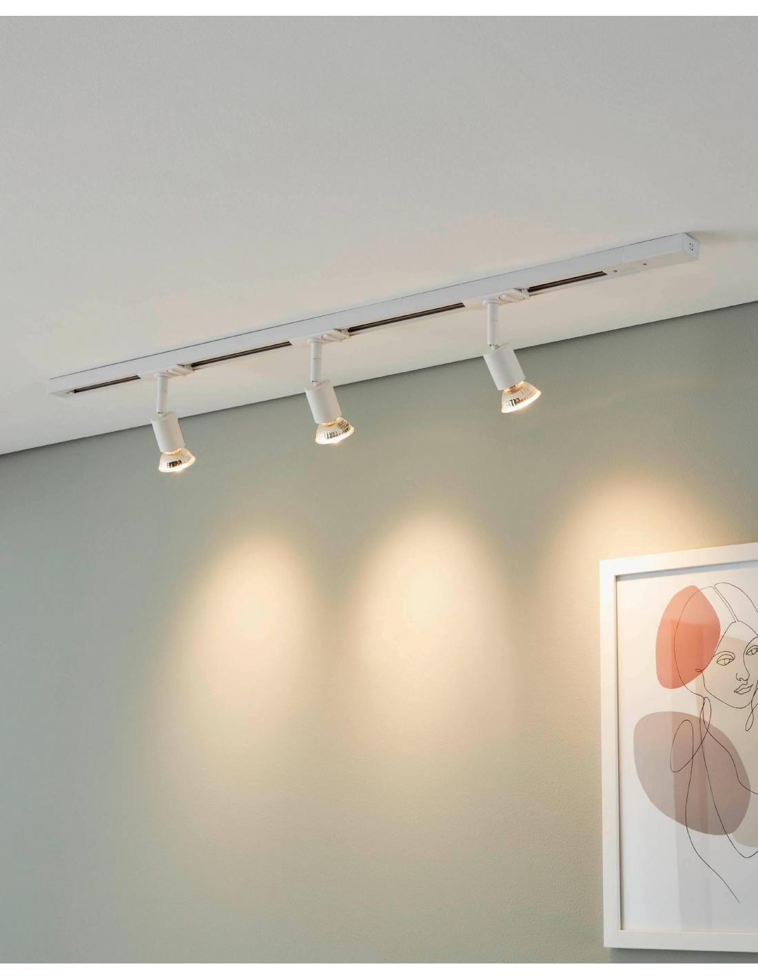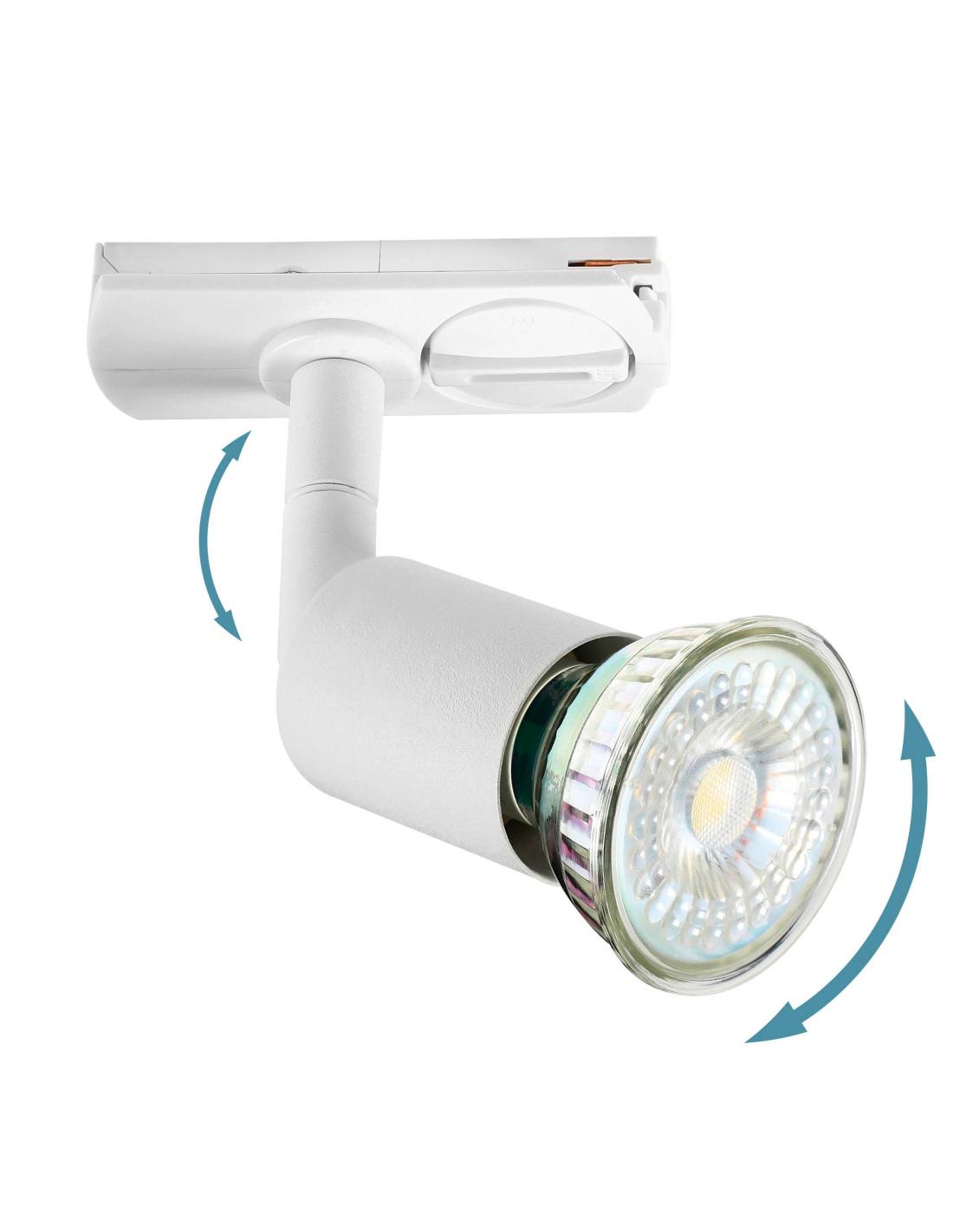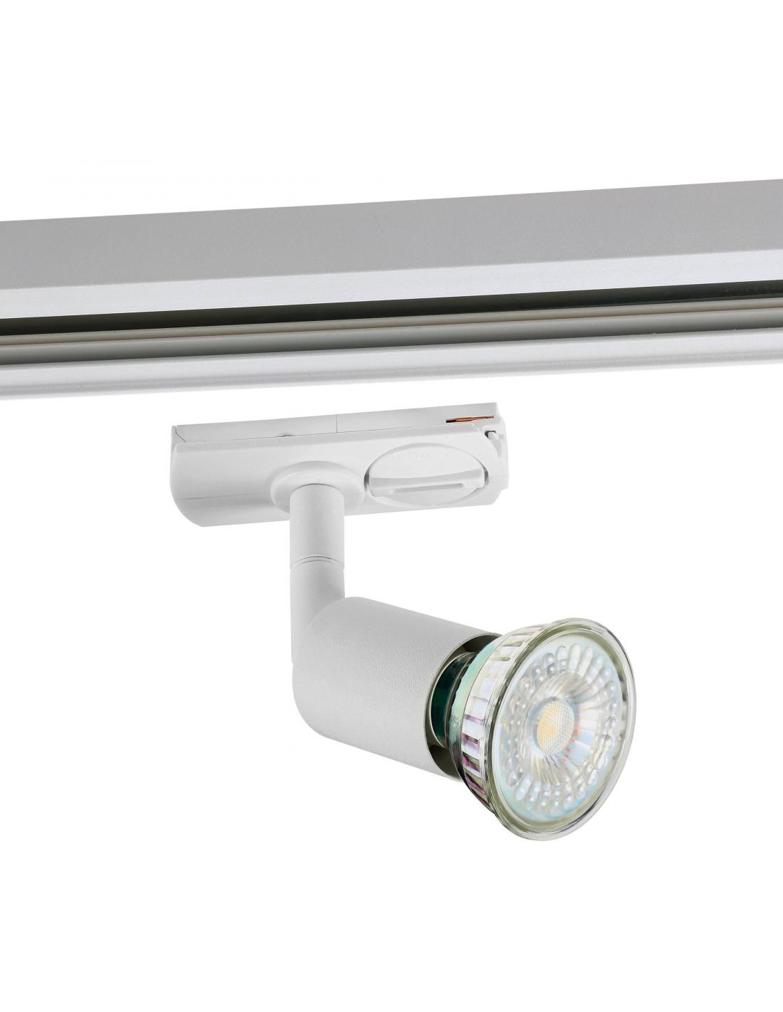 Foco de bombilla GU10 para carriles de techo. Está compuesto por una base acrílica blanca y un cabezal giratorio de metal también en blanco. Este foco se puede insertar fácilmente en el riel donde necesites colocarlo gracias a su sistema de clic y adaptador integrado. Es un foco de carril de techo o pared muy útil para comercios o estancias donde utilices este sistema de iluminación móvil, que te hará la vida mucho más sencilla. Necesita una bombilla GU10, no incluida.