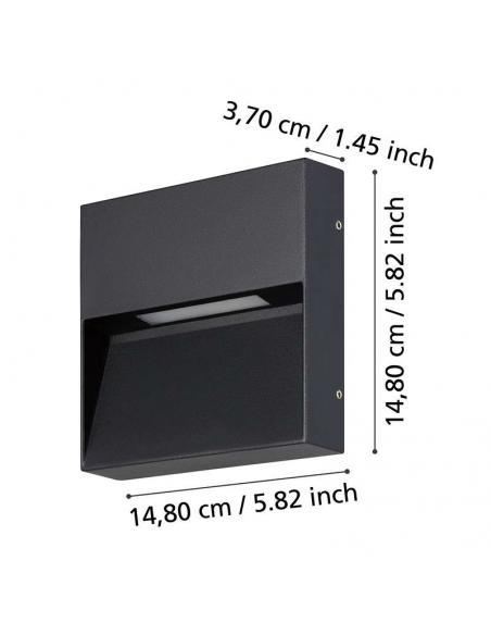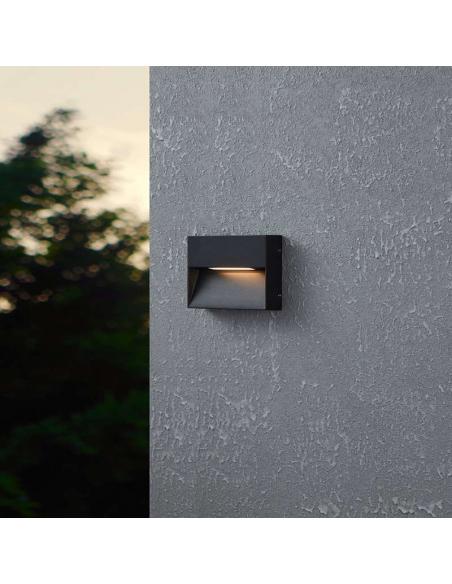 La lámpara de pared exterior LED Spongano tiene en una carcasa de aluminio cuadrado, de color antracita y un tono de vidrio transparente.
