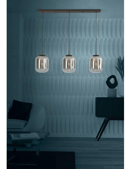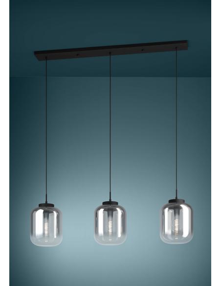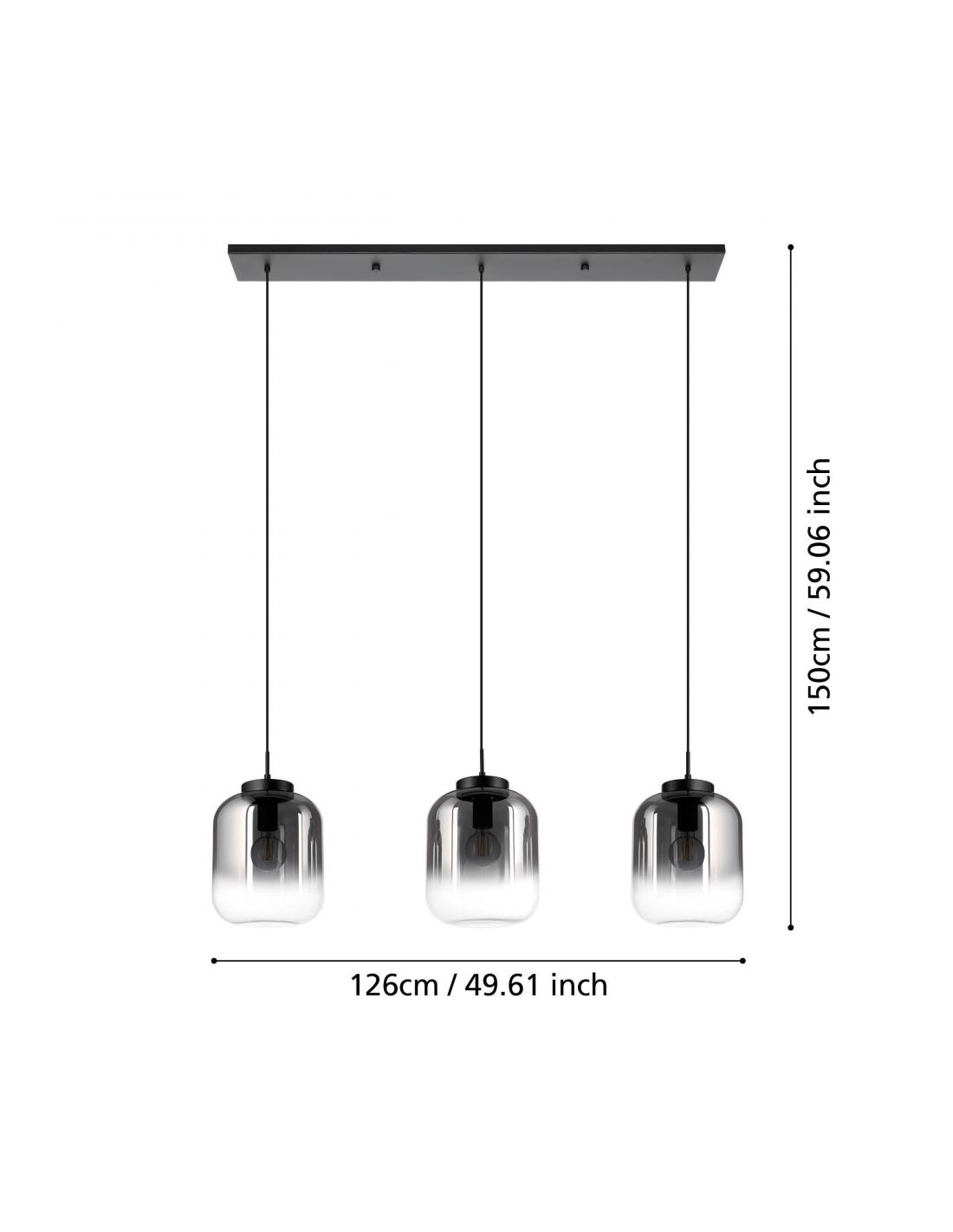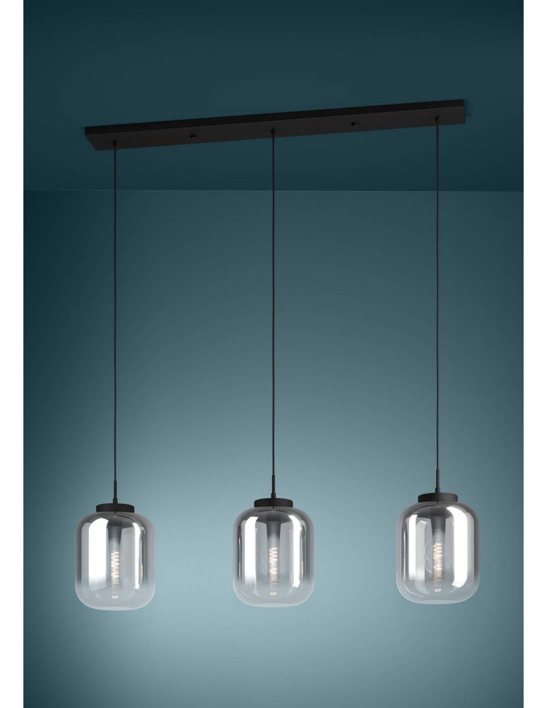 La lámpara colgante BULCIAGO está formada por tres grandes tulipas de cristal transparente negro (fumé) y una suspensión de metal negro. La lámpara colgante encaja a la perfección en cualquier estilo de decoración moderno. La lámpara proporciona una iluminación elegante en cualquier estancia, ya sea en el salón o sobre la mesa del comedor. Las bombillas de filamentos que se muestran no están incluidas. La lámpara es apta para cualquier bombilla con casquillo E27.