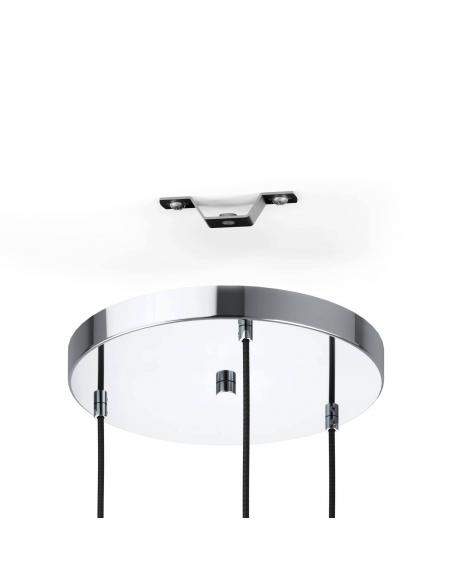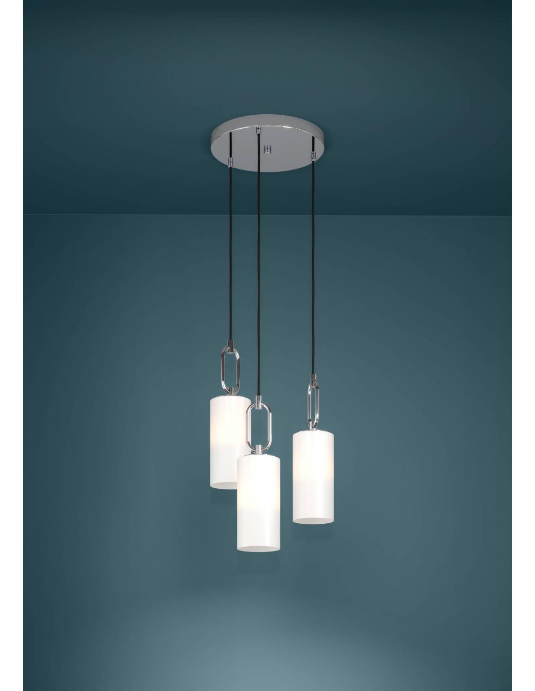 La lámpara colgante MAJANA está formada por tres pantallas cilíndricas de cristal opal mate en color blanco, que se encuentran suspendidas de un dosel redondo de metal en colores cromo a diferentes alturas con cables textiles negros. La combinación de las pantallas con el soporte ovalado en cromo le da a la lámpara su aspecto especial. Gracias a su elegante diseño, queda bien en diferentes estilos de decoración y ofrece una iluminación moderna en el salón o el comedor. Las bombillas no están incluidas. La lámpara es apta para cualquier bombilla con casquillo E27.