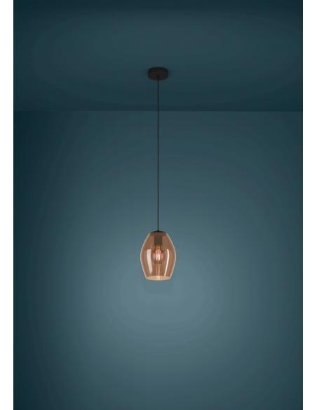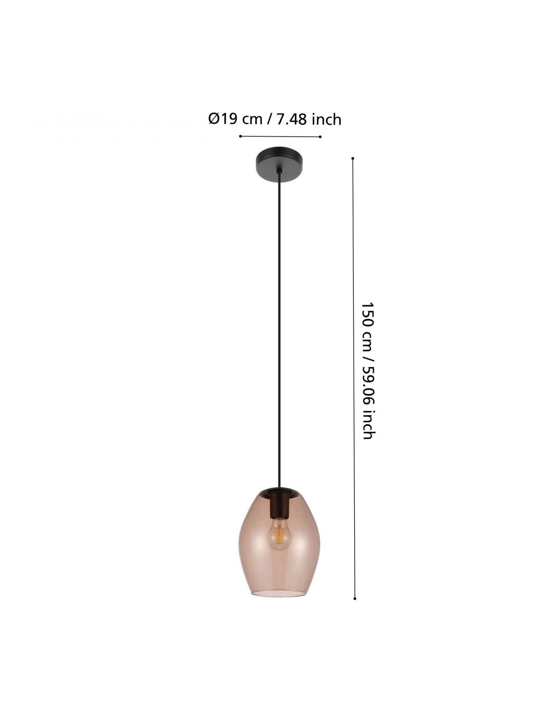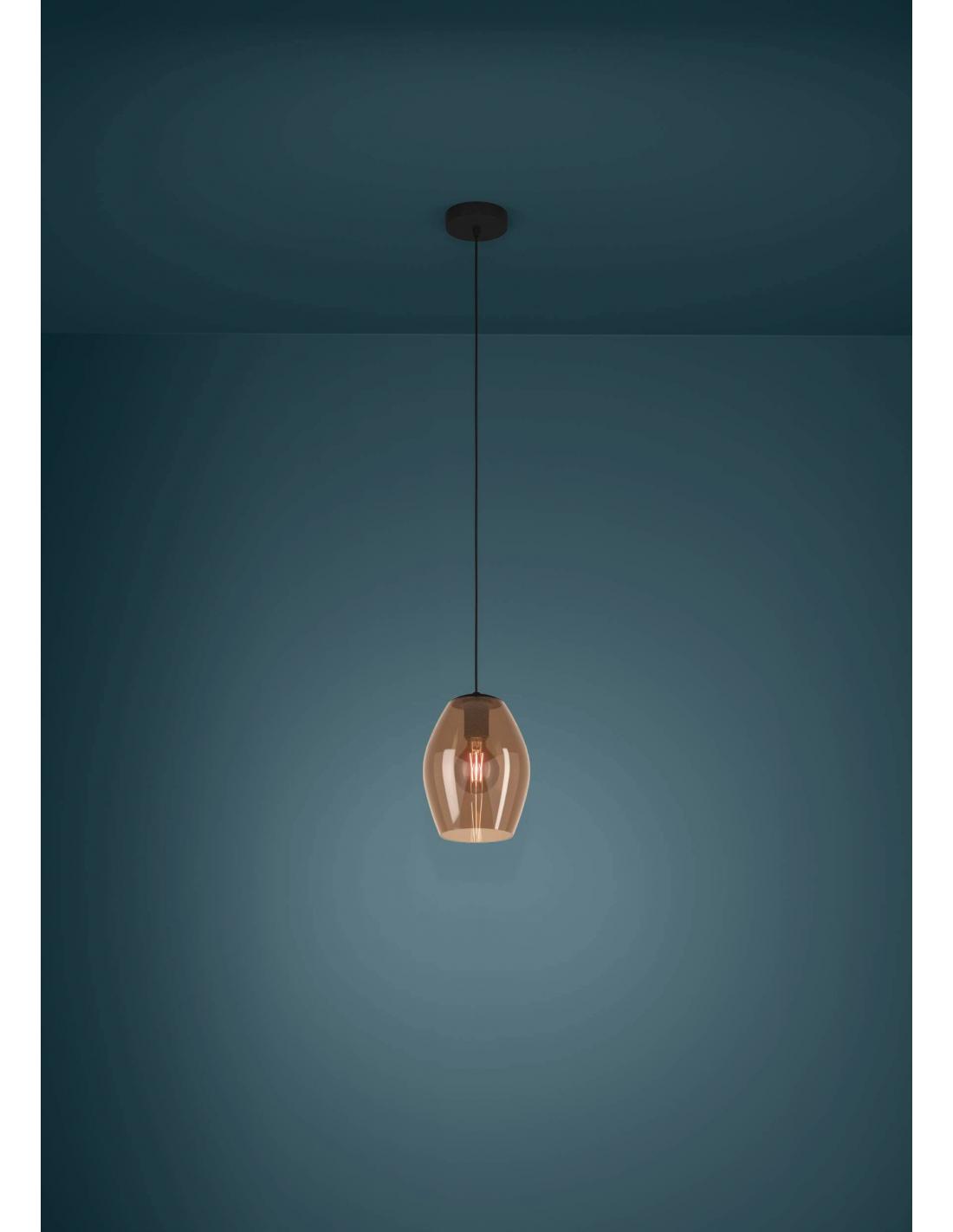 La lámpara colgante ESTANYS 1 está realizada con una pantalla de vidrio marrón-transparente suspendida de un dosel de metal negro con un cable textil negro. La lámpara colgante de moderno diseño proporciona una iluminación acogedora en el salón o sobre la mesa del comedor. La bombilla de filamentos que se muestra no está incluida. La lámpara es apta para cualquier bombilla con casquillo E27.