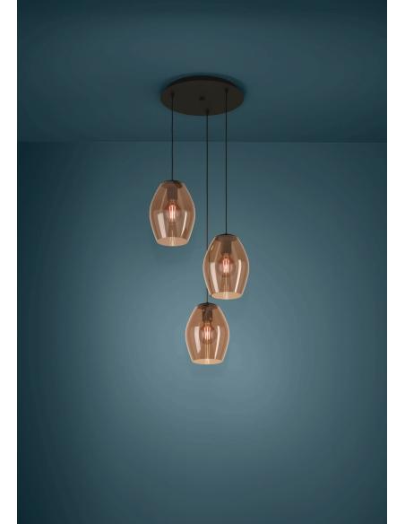 La lámpara colgante ESTANYS 1 está realizada con tres pantallas de vidrio marrón-transparente, suspendidas de un dosel de metal negro a diferentes alturas con cables textiles negros. La lámpara colgante de moderno diseño proporciona una iluminación acogedora en el salón o sobre la mesa del comedor. Las bombillas de filamentos que se muestran no están incluidas. La lámpara es apta para cualquier bombilla con casquillo E27.