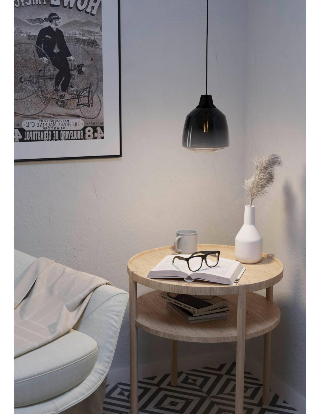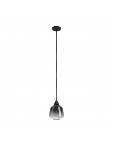 Lámpara colgante fabricada con tulipa de cristal acabado fumé en color negro, con cable regulable en altura y base de acero, ambos en color negro. Su estética la hace versátil para instalar en casi cualquier tipo de decoración. Utiliza una bombilla de casquillo E27, no incluida.