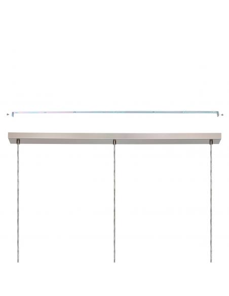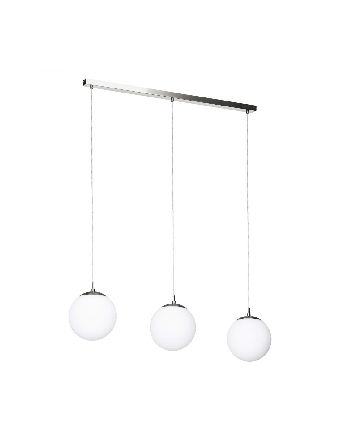 Lámpara colgante de tres luces diseñada por tres esferas de cristal blanco mate opal suspendidas sobre un cableado con base plateada. Una pieza de tres luces que llega para compaginar las top venta Rondo individuales de la misma colección, y que podrás instalar sobre tu mesa de comedor o donde más te guste. Utiliza tres bombillas de casquillo e27, no incluidas.