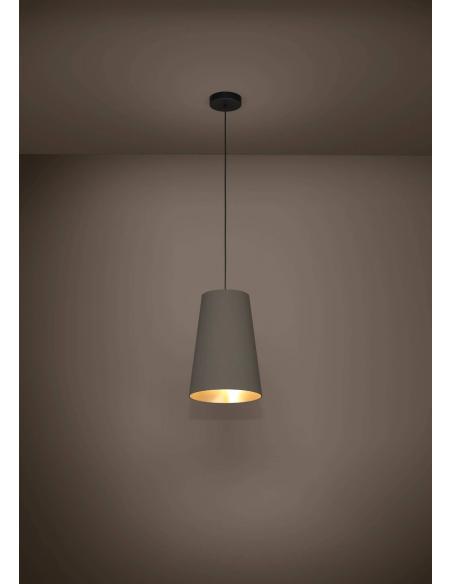 La lámpara colgante PETROSA se compone de una gran pantalla cónica realizada en tejido color capuchino y un interior recubierto de latón. El cable textil negro y el dosel metálico del mismo color encajan a la perfección en el look minimalista de la lámpara. La lámpara colgante en estilo Retro-Chic de los años 60 completa especialmente el mobiliario moderno y ofrece una iluminación acogedora en el salón o en el comedor, sobre la mesa. La bombilla no está incluida. La lámpara es apta para cualquier bombilla con casquillo E27.