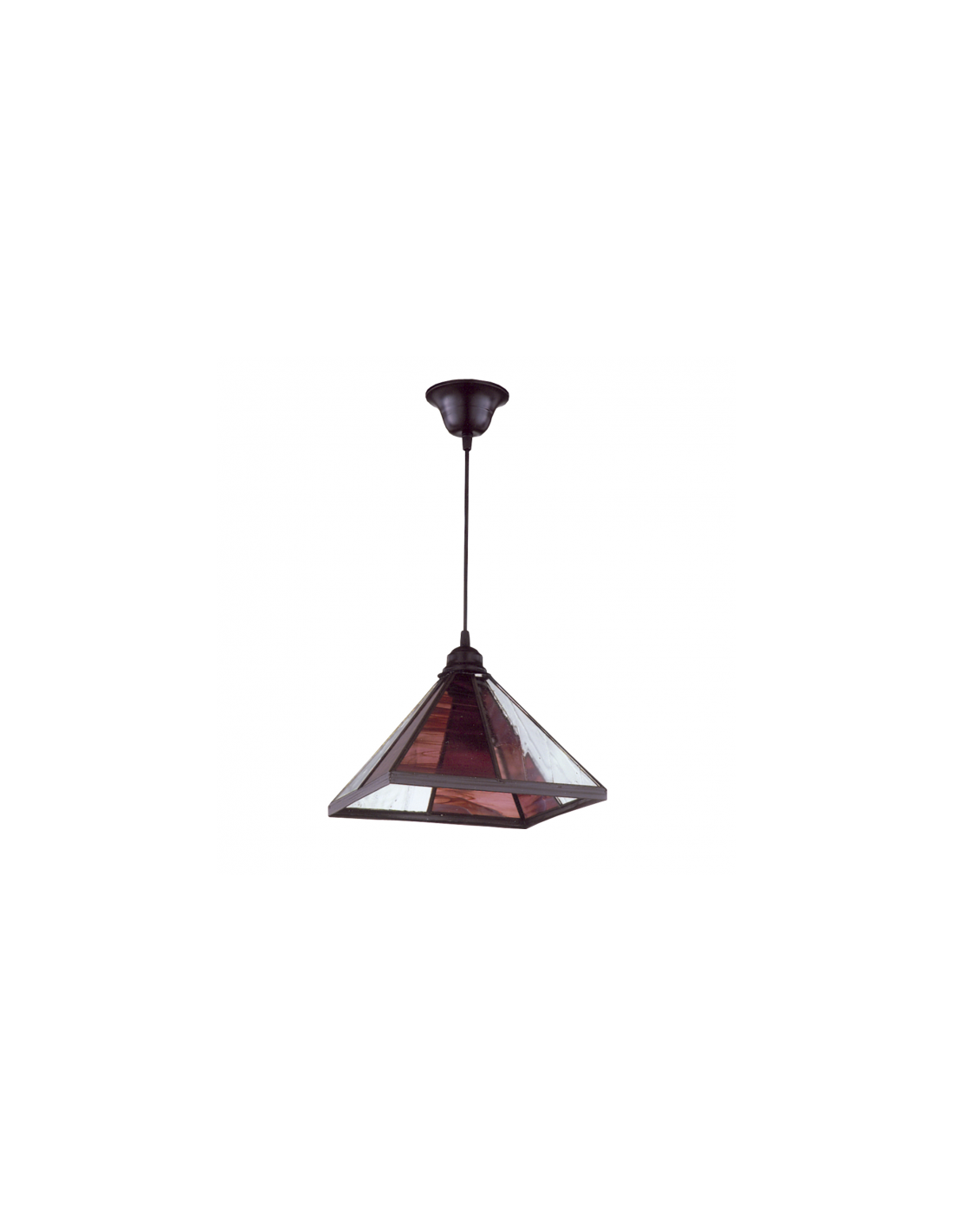 Colgante serie Pirámide de color violeta. Realizado en cristal y metal. Destaca su forma piramidal y su diseño basado en las vidrieras de color. Posee un portalámparas E27. Su uso está recomendado para interiores.
