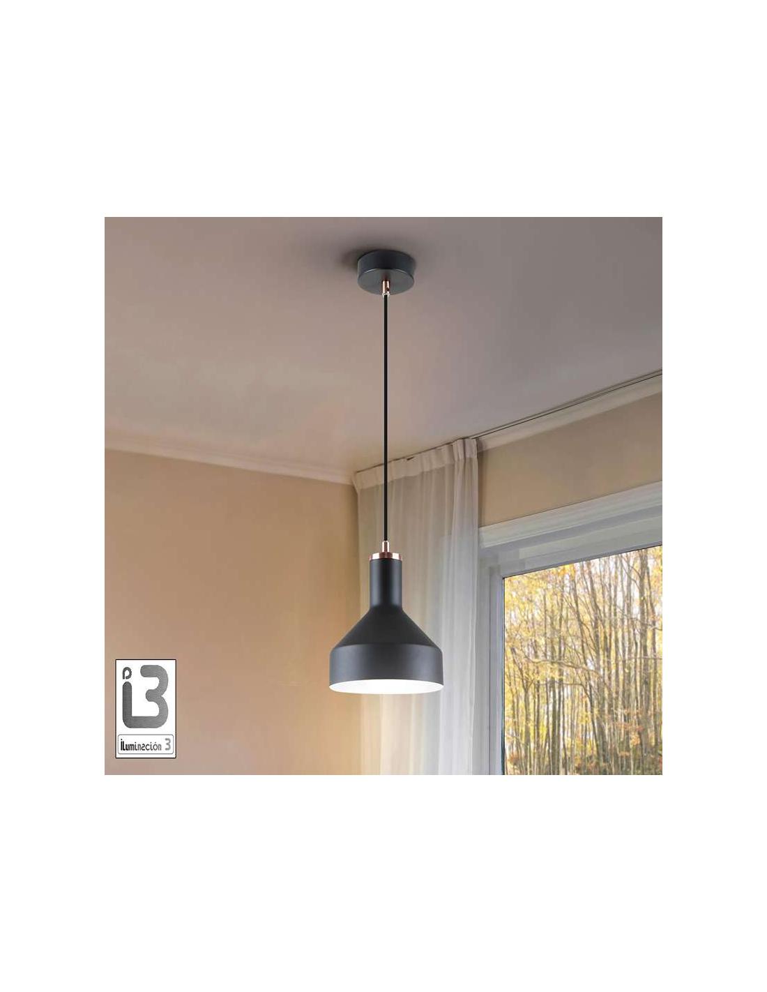 Lámpara de 1 luz realizada en metal acabado negro mate y detalles en cobre satinado. Altura regulable. 1 E27
