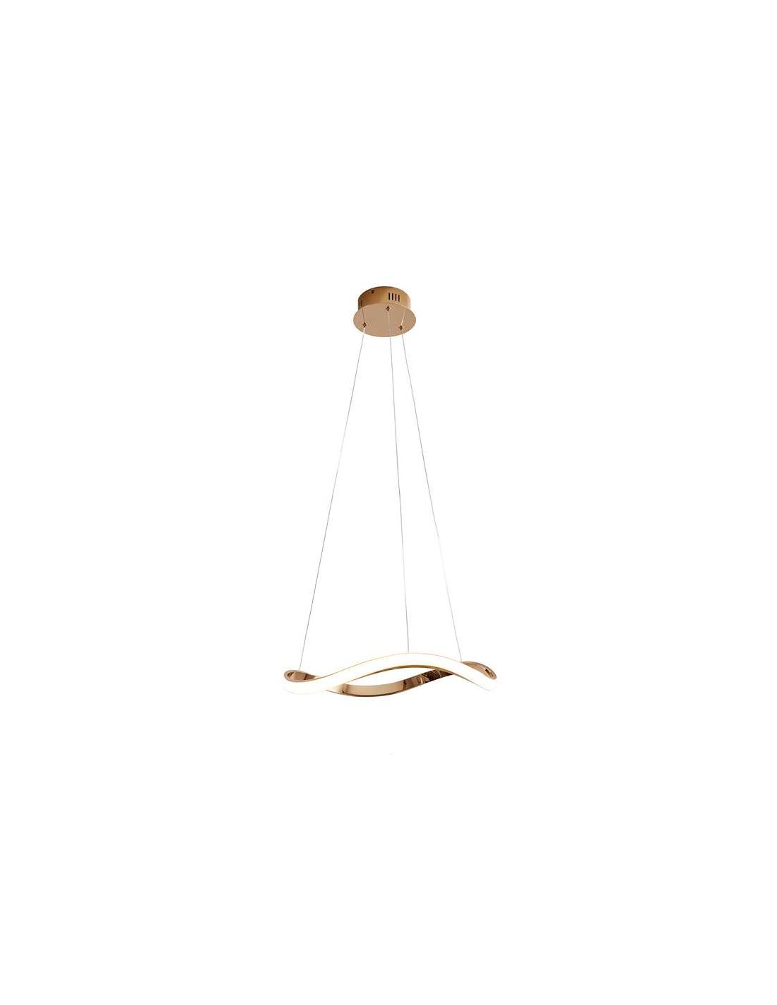 Lampara de un aro curvado. Realizada en metal y aluminio. Acabado oro rosa brillo. Difusor de silicona opal. Altura regulable. 27W LED, 1.600 l, 3.000K