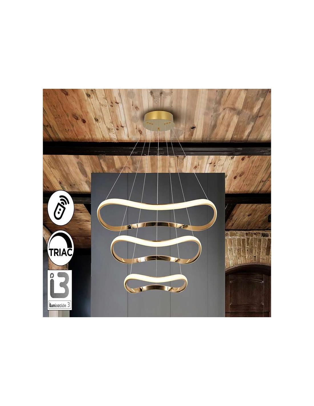 Lámpara de tres aros curvados, realizada en metal y aluminio. Acabado oro rosa brillo. Difusor de silicona opal. Altura regulable. 68W,3.700lm, 3.000K. DIMABLE, incluye mando a distancia.