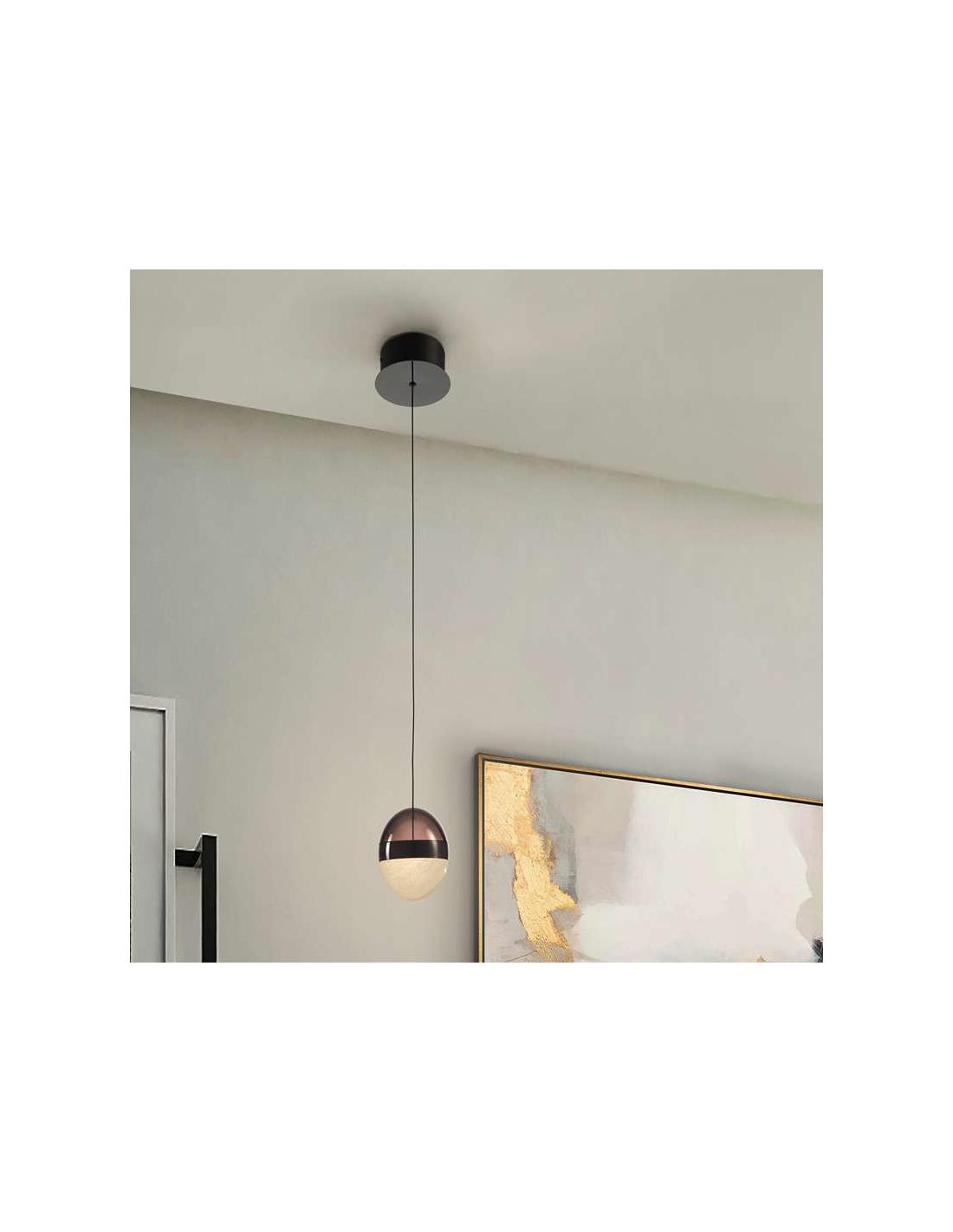 Lámpara LED, realizada en metal acabado negro. Tulipa de Ø12 cm, de policarbonato smoke y cristal marmoleado. con aro de metal acabado en cromo negro. 7W LED. 3.000K. 318 lm.