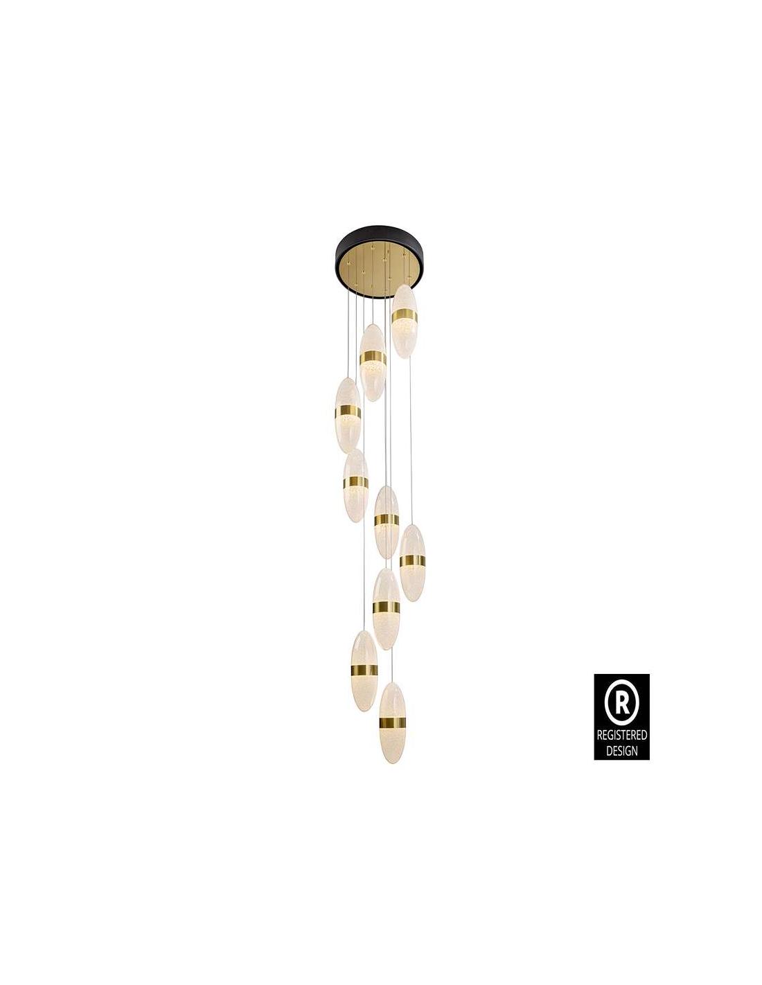 Lámpara de 9 luces LED, realizada en metal acabado negro y oro. Tulipa esferoidal de Ø15 cm de policarbonato con interior texturizado y aro metal en latón. Altura regulable. 54 W LED. 3.000 K. 4.621lm. DIMABLE