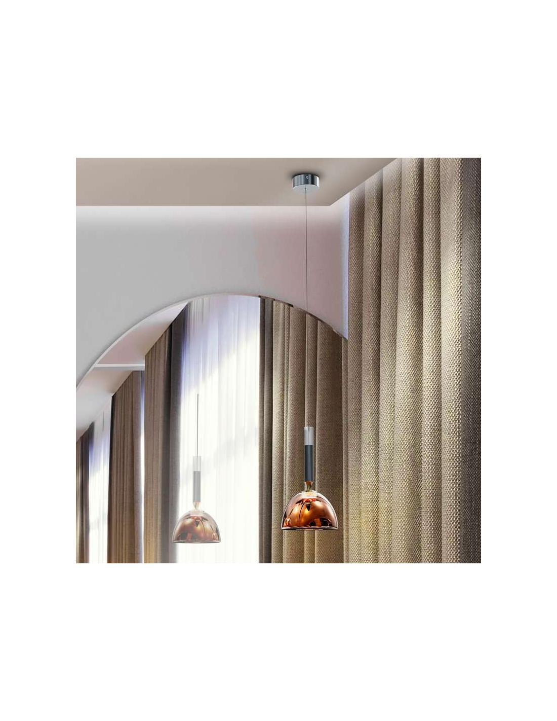 Lámpara de 1 luz, realizada en aluminio cepillado acabado en tono gris oscuro. Tulipa de cristal espejado con baño electrolítico en tono cobre, con luz LED y difusor de acrílico opal. 6W LED, 220 lm, 3000K
