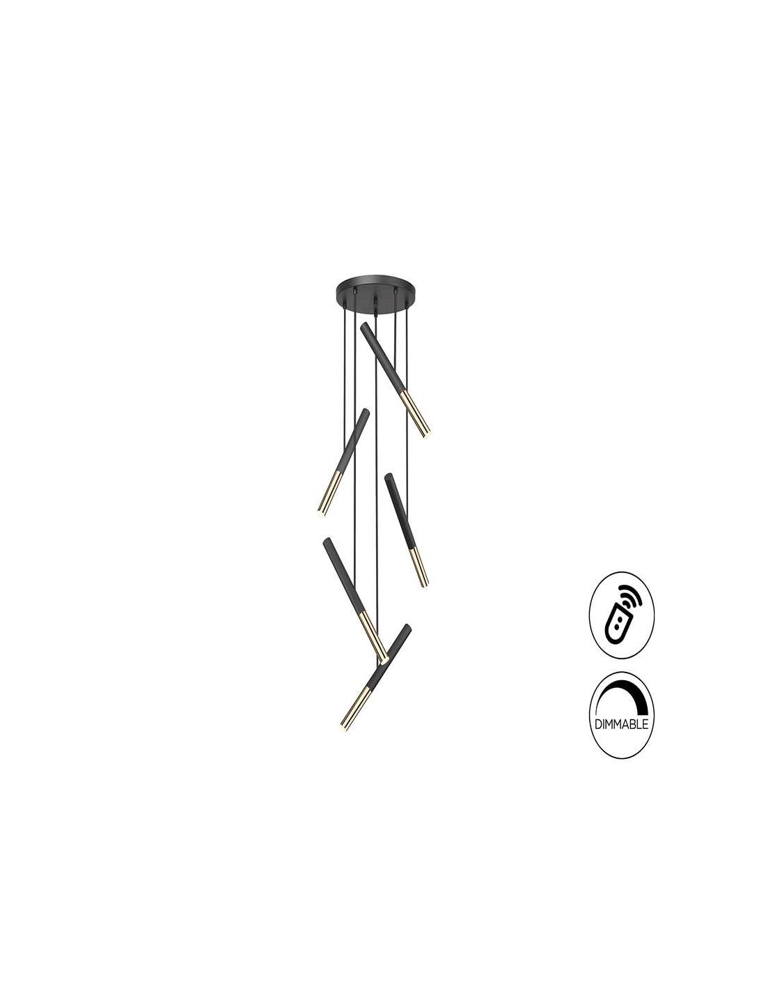 Lámpara de 5 luces, realizada en metal acabado negro mate y oro brillo. Difusores de acrílico opal. Altura regulable. 25W LED, 2.250 lm, 3.000 K. DIMABLE.