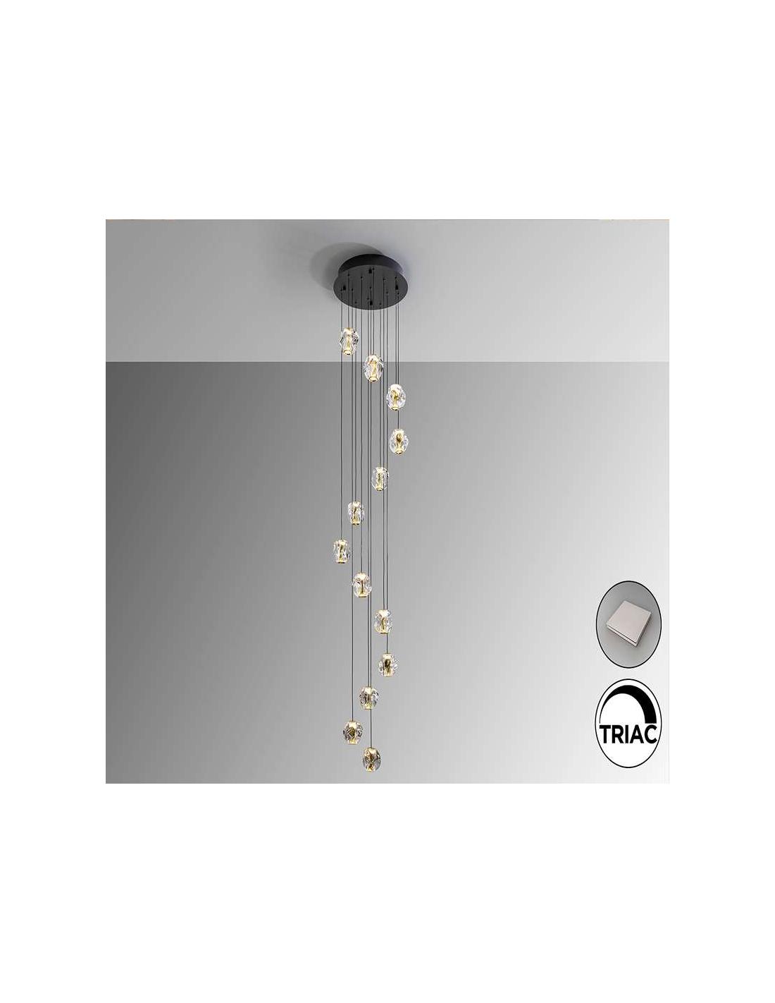 Lampara de 13 luces, realizada en metal acabado negro mate con detalles dorados y tulipas de acrílico transparente. 54,5W LED, 3853 lm, 3000K. Incluye driver TRIAC y SET DIMADO.