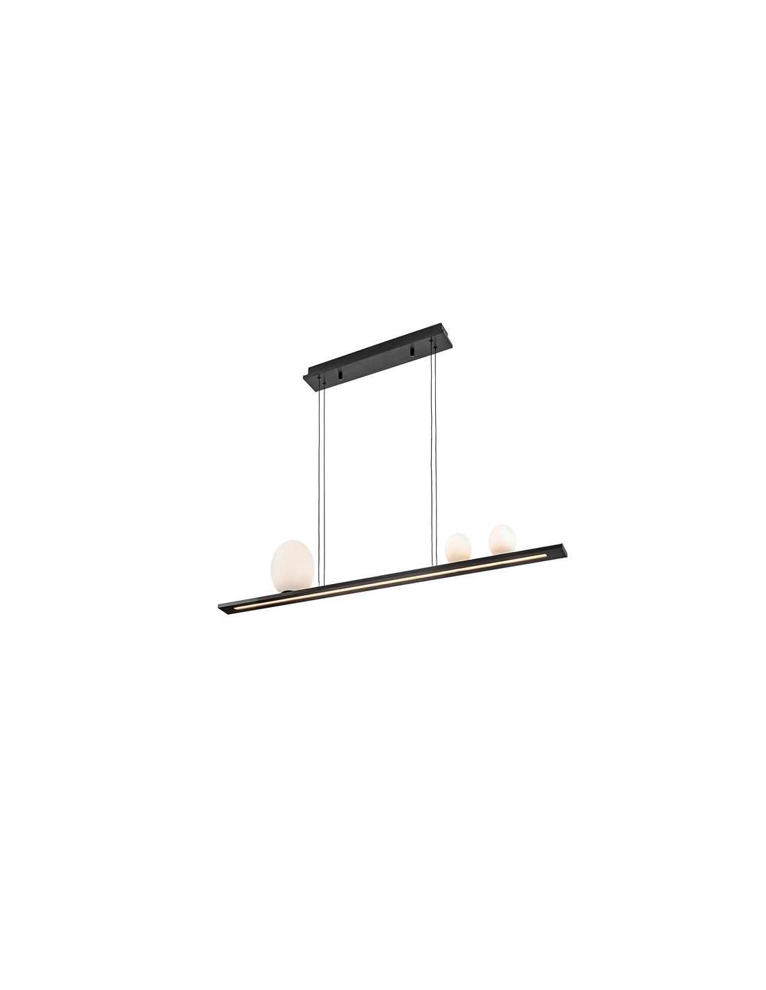Lámpara realizada en aluminio cepilado, acabado negro. 3 tulipas esféricas de cristal matizado blanco y difusor inferior en acrílico opal. 31W LED, 1.204 lm, 3000K.