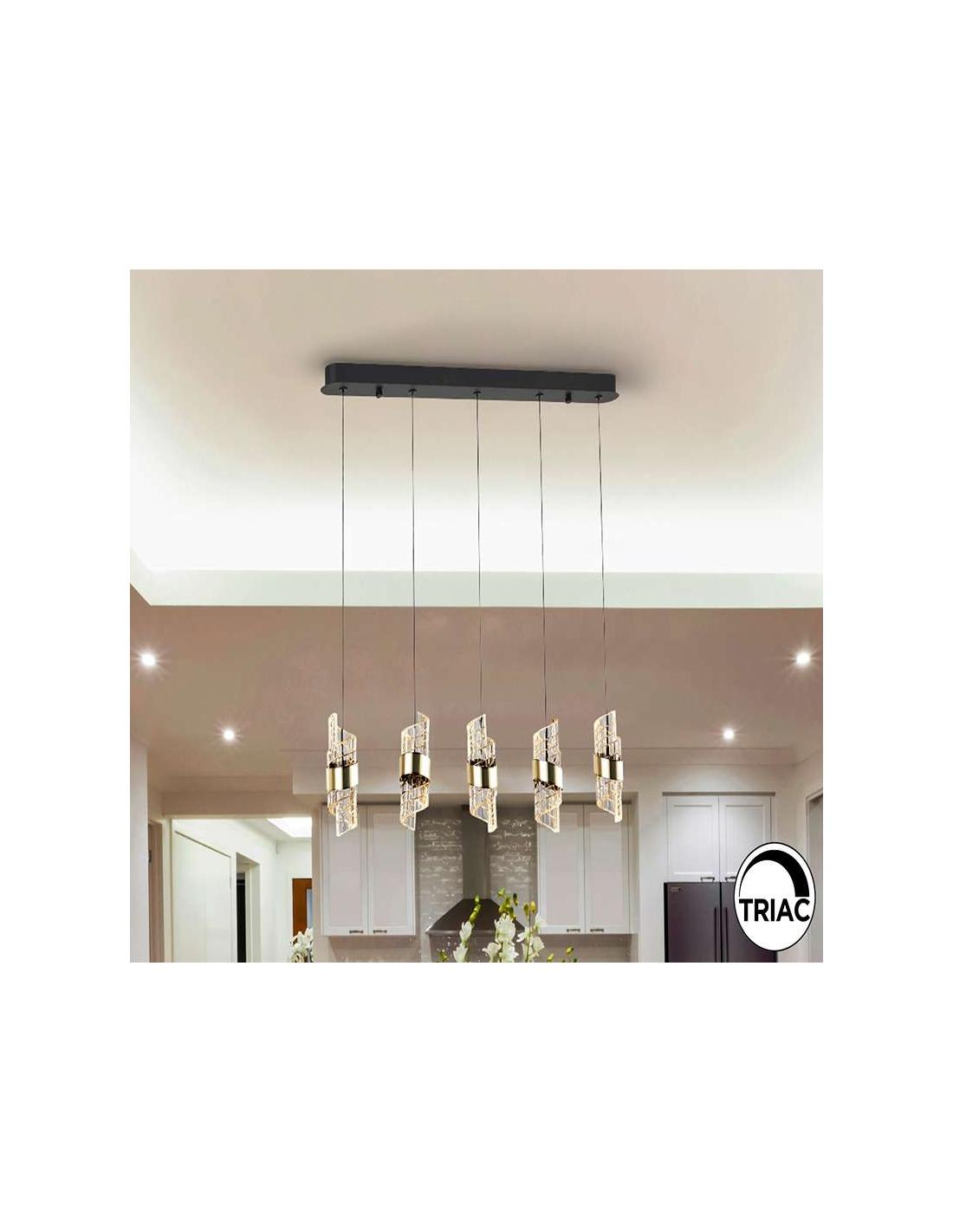 Lámpara de 5 luces LED. Realizada en metal acabado negro mate y oro brillo. Tulipas con diseño en espiral, realizadas en acrílico moldeado y tallado. Regulables en altura. 35W LED.3,200 lm. 3.000 K. DIMABLE.