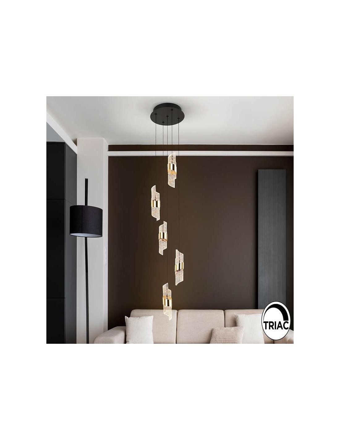 Lámpara de 5 luces LED. Realizada en metal acabado negro mate y oro brillo. Tulipas con diseño en espiral, realizadas en acrílico moldeado y tallado. Regulables en altura. 35W LED. 3.220 lm. 3.000 K. DIMABLE.