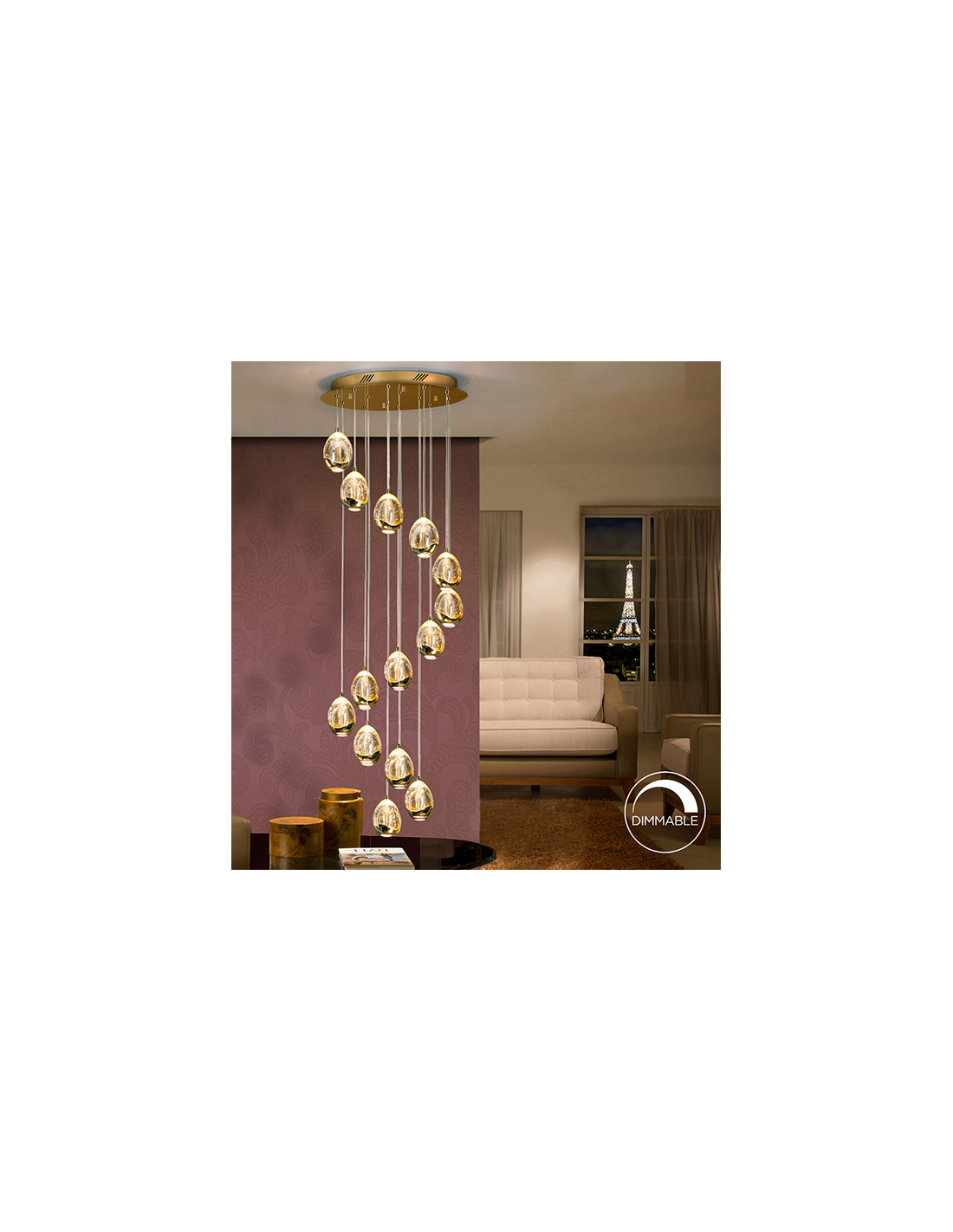 Lámpara de 14 luces LED. Realizada en metal acabado dorado. Tulipas con forma de gota, cristal macizo en tono champán, burbujas decorativas en su interior. Regulables en altura. 70W LED, 6.720 lm, 3.000 K. DIMABLE. Incluye driver TRIAC y SET DIMADO.