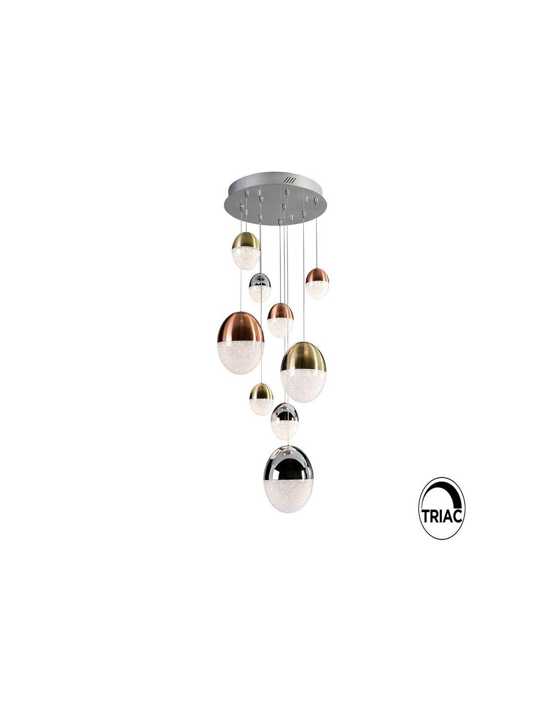 Lámpara de 9 luces, metal acabado cromo. Tulipas esféricas de 10cm, 12cm y 20cm, en policarbonato con interior texturizado y metal en cobre y latón satinados y cromo. Altura regulable. 54W LED. 3.000K. 3.780 lm. DIMABLE. Driver TRIAC y SET DIMADO.