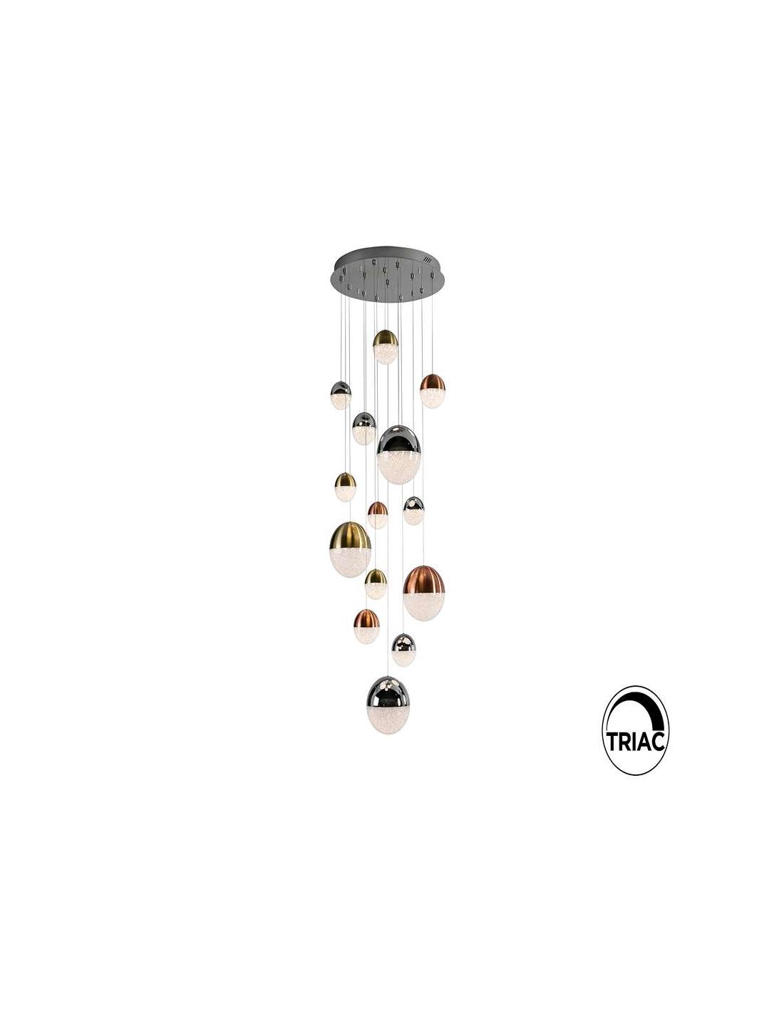 Lámpara de 14L. LED en metal cromado. Tulipas de 10, 12 y 20 cm de Ø, de policarbonato con interior texturizado y metal en cobre satinado, latón satinado y cromo. 78,6W LED. 3.000K. 5.502 lm. Driver TRIAC y SET DIMADO.