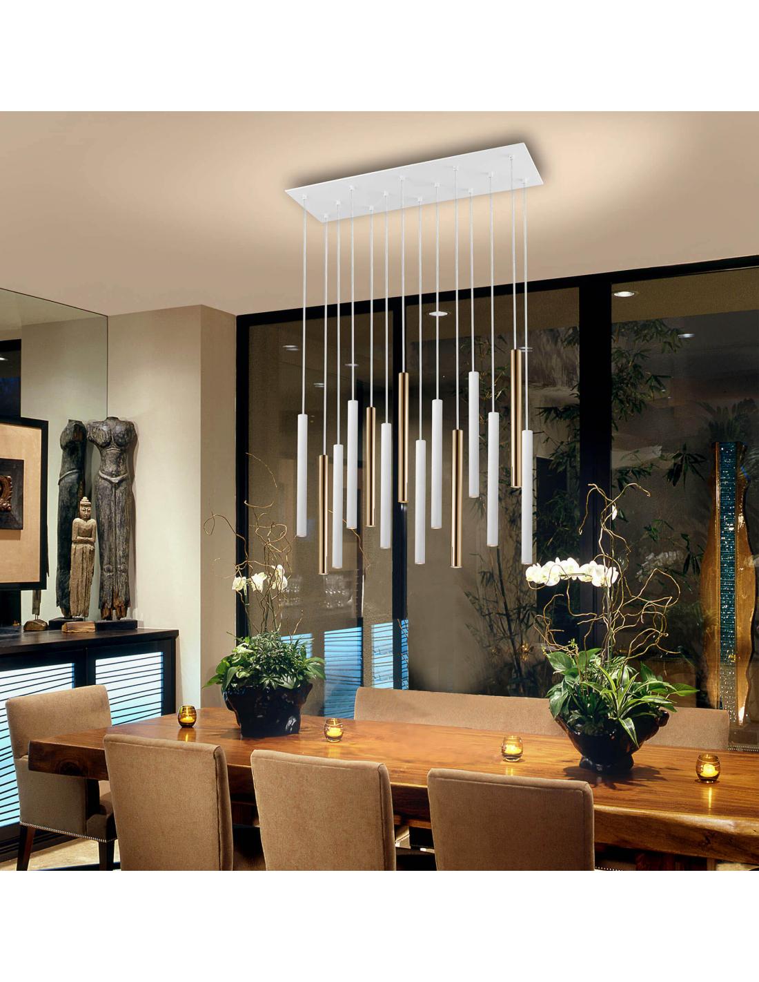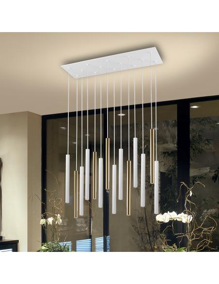 Lámpara de 14 luces LED. Realizada en metal acabado oro brillo y blanco mate. Difusor acrílico opal. 70W LED, 6.300 lm, 3.000 K. DIMABLE DISPONIBLE CON 3 METROS DE ALTURA. REFERENCIA: 373437G