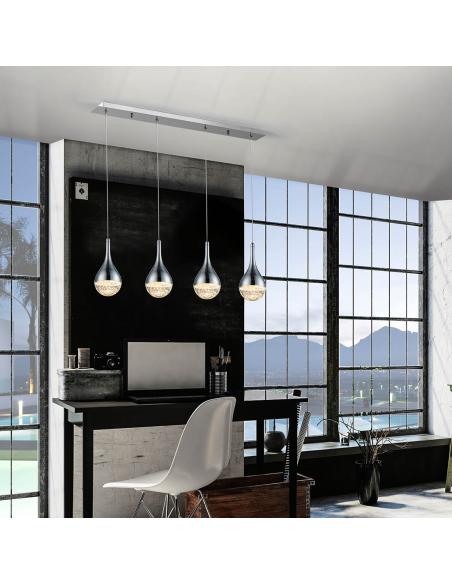 Lámpara de 4 luces LED, realizada en metal acabado cromo. Tulipas con forma de gota realizadas en cristal macizo con burbujas decorativas en su interior. Regulables en altura. 4x5W LED. 1.600 lm. 3.000 K.