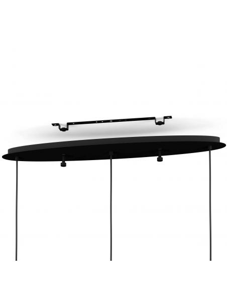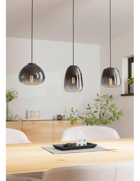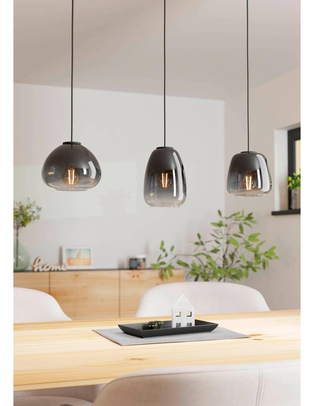La lámpara colgante AGUILARES está formada por tres pantallas de vidrio suspendidas con suaves curvas. El degradado de color negro-transparente y la suspensión con cables textiles negros del dosel ovalado de metal negro completan hábilmente el aspecto elegante de la lámpara. La lámpara colgante se adapta perfectamente a los estilos de decoración modernos y ofrece una iluminación especial en el salón o sobre la mesa del comedor. Las bombillas de filamentos que se muestran no están incluidas. La lámpara es apta para cualquier bombilla con casquillo E27.