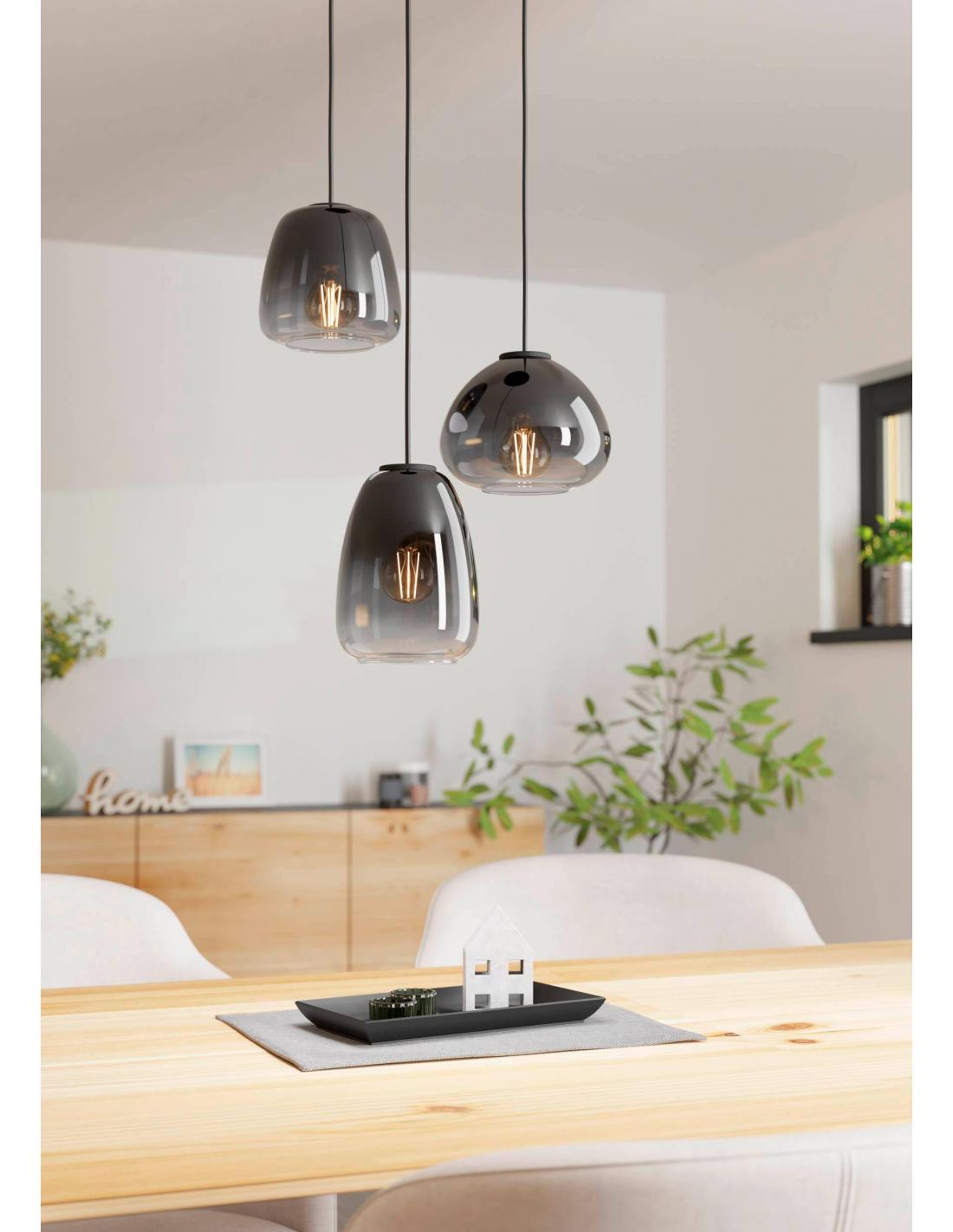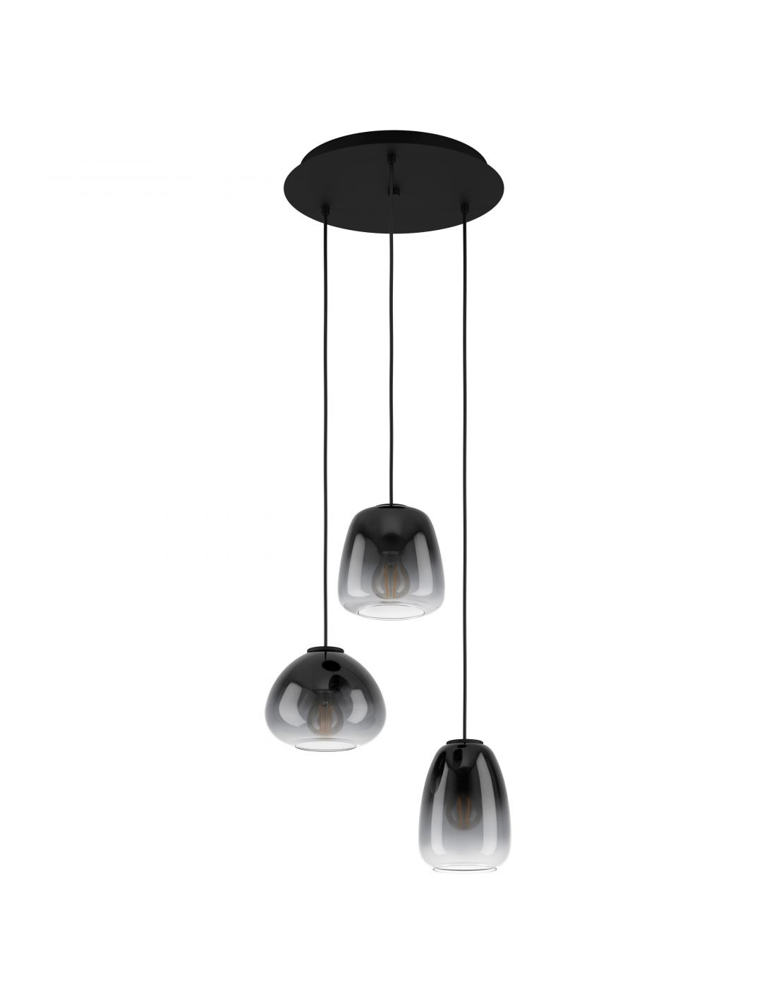 La lámpara colgante AGUILARES está formada por tres pantallas de vidrio suspendidas con suaves curvas. El degradado de color negro-transparente y la suspensión a diferentes alturas con cables textiles negros del dosel redondo de metal negro completan hábilmente el aspecto elegante de la lámpara. La lámpara colgante se adapta perfectamente a los estilos de decoración modernos y ofrece una iluminación especial en el salón o sobre la mesa del comedor. Las bombillas de filamentos que se muestran no están incluidas. La lámpara es apta para cualquier bombilla con casquillo E27.