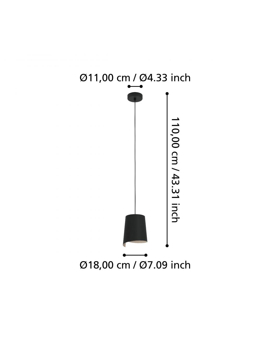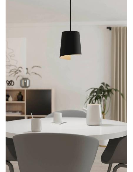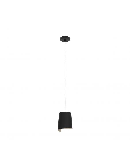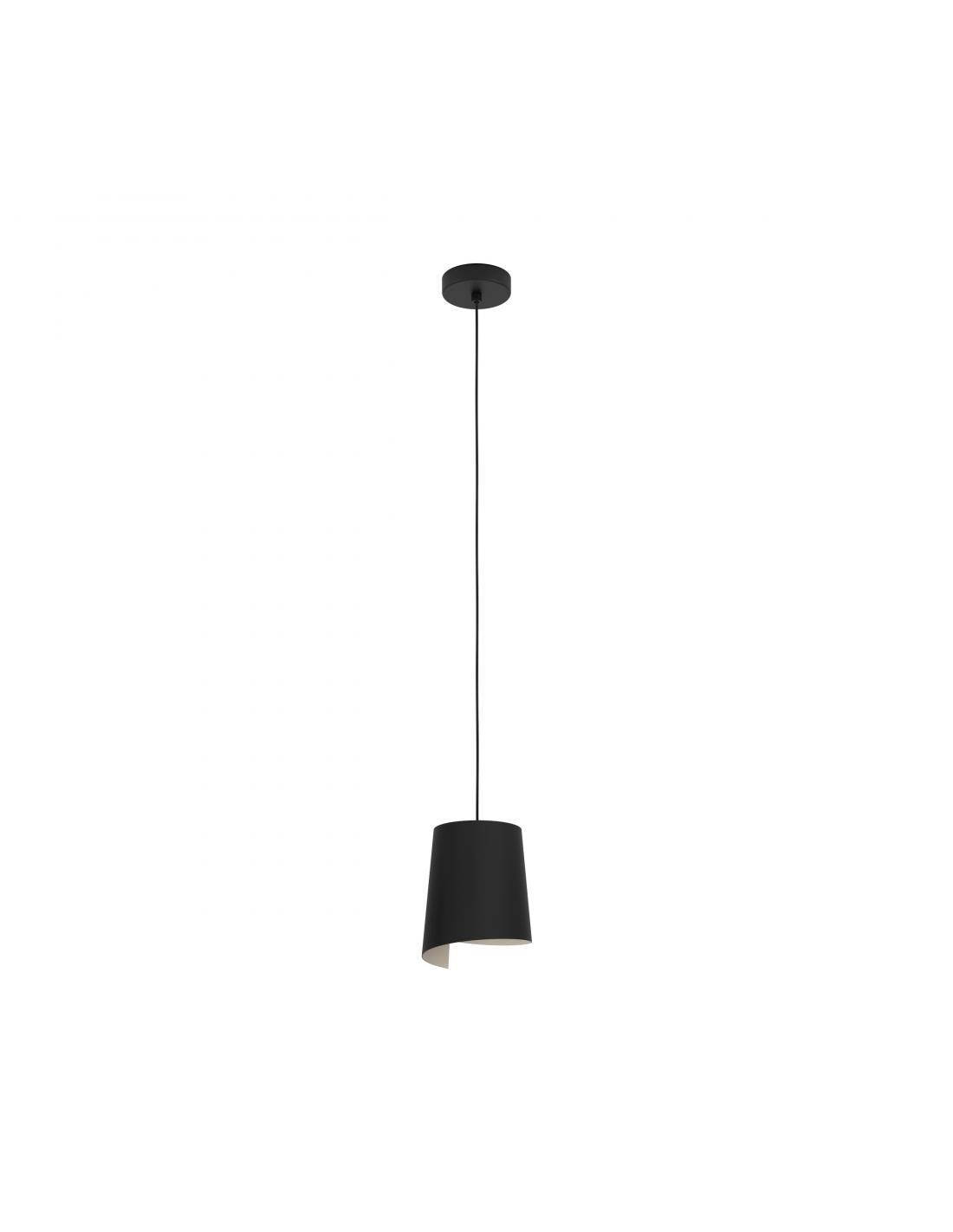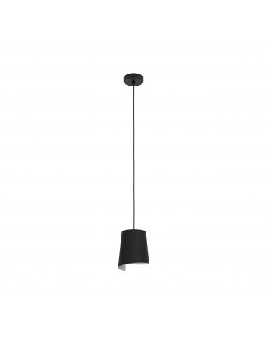 Lámpara colgante de color negro de acero con tulipa semi circular alargada con interior en color beige, cuyo color le quita seriedad al modelo y la hace adaptable a entornos suaves y de tonos más claros. Es perfecta para cualquier rincón gracias a su tamaño, ya sea sobre una pequeña mesa de comedor, sobre una mesita auxiliar o sobre una mesita de noche en el dormitorio. Utiliza una bombilla de casquillo E27, no incluida.