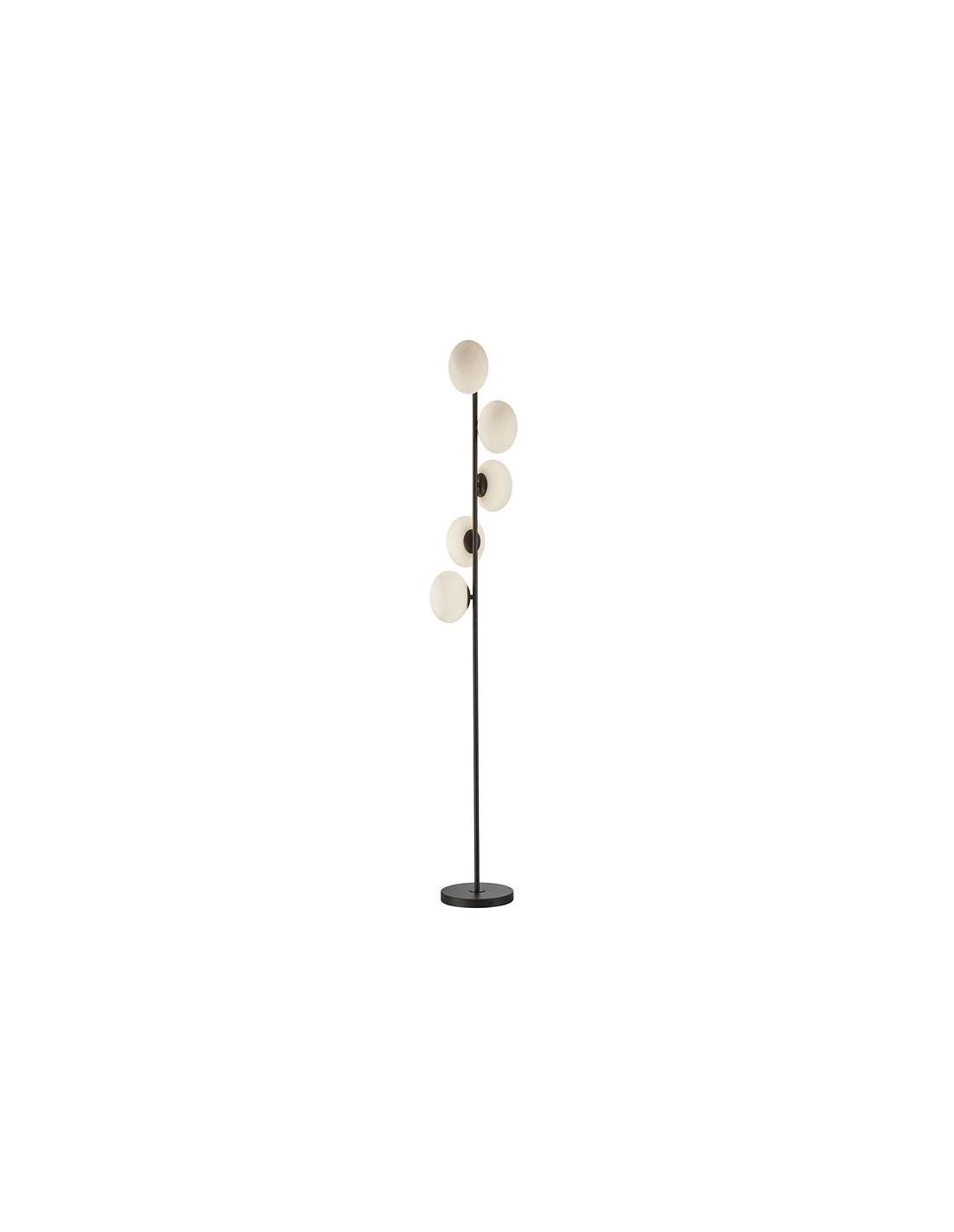 Lámpara de pie realizada en metal, acabado negro mate. Tulipas esféricas de cristal ácido opal.