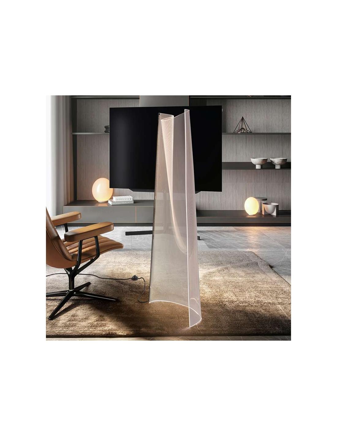 Lámpara de pie formada por una lámina de metacrilato microimpreso moldeado y perfíl metálico cromado. Iluminación LED 24W, 1.500 lm, 3.000K.