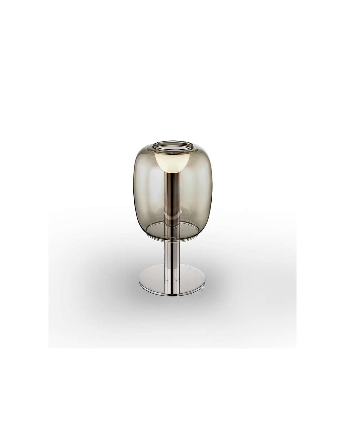 Lámpara de sobremesa realizado en metal acabado cromo. Tulipa de cristal soplado acabado smoke. Iluminación LED 5W, 500 lm, 3.000K.