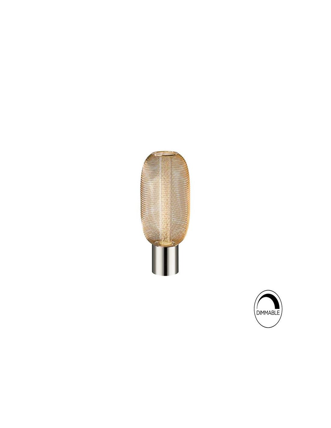 Lámpara de sobremesa de 1 luz realizada en metal cromado. Doble tulipa con cilindro interior de acrílico transparente con burbujas y óvalo exterior de malla metálica oro brillo. 5W LED, 450 lm, 3.000 K.