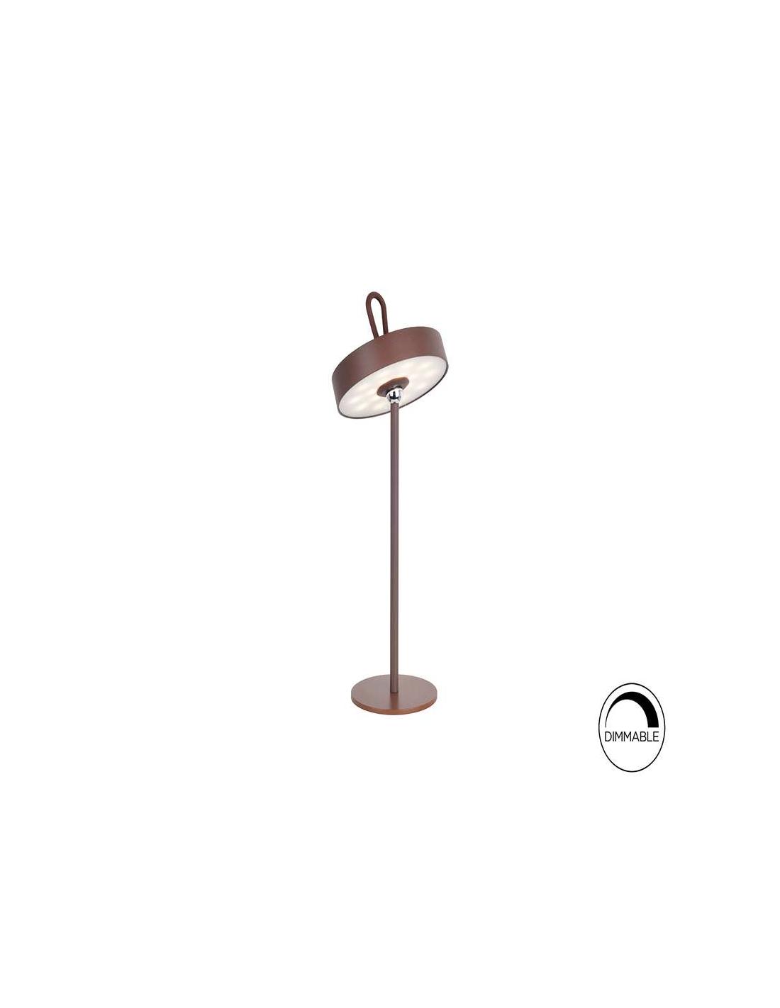 Sobremesa LED para interior y exterior, pantalla portátil con asa de silicona y soporte magnético. Realizado en metal acabado corten y difusor acrílico opal. 2,5W LED, 140lm, 3000K. DIMABLE. IP54.