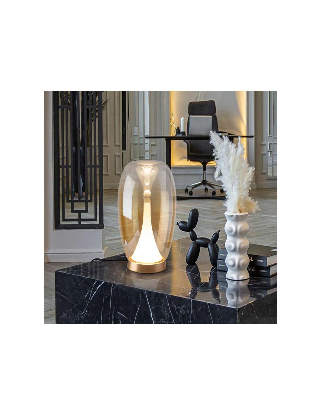 Lámpara de sobremesa realizada en aluminio dorado anodizado, con tulipa de cristal soplado acabado ambar degradado y difusor interior opal. 8,5W LED, 504 lm, 3.000 K.